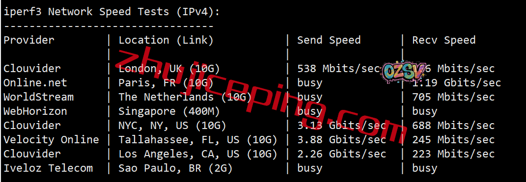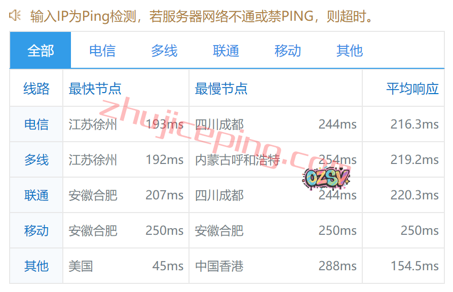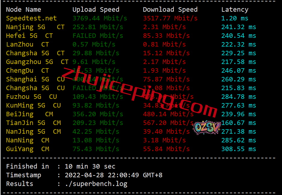 我们大致看看小鸡能跑到多少的上行和下行带宽吧?第一个节点为就近的,其余的是国内三网节点的效果,大致数据如下: