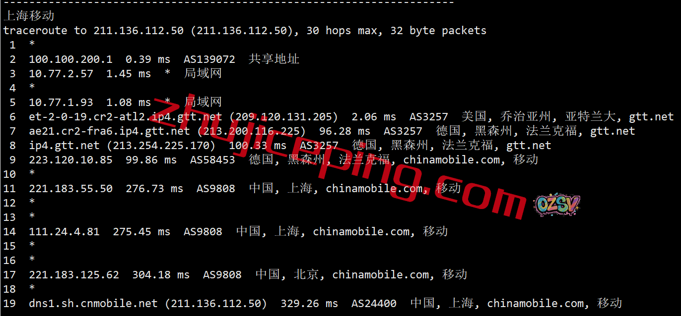 上海方向:走GTT到德国法兰克福,然后转移动在法兰克福的节点后直接回国