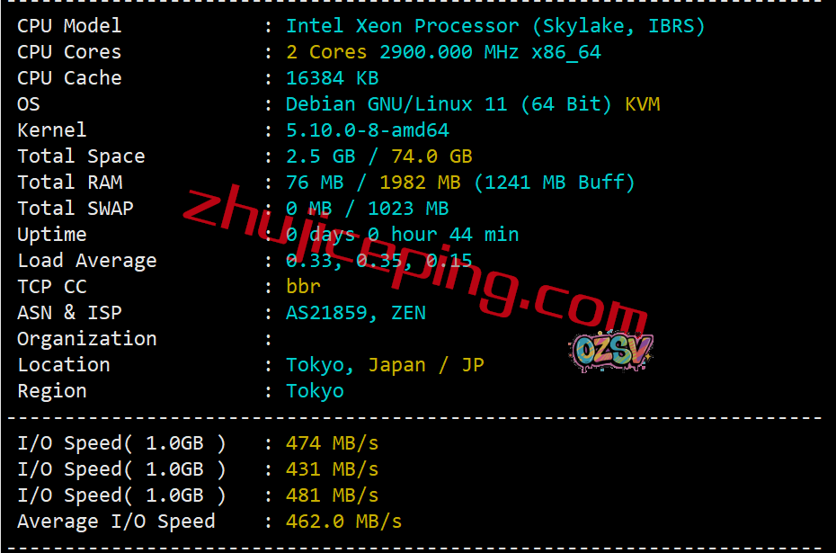 CPU虚拟化之后看不到具体型号,大致主频2.9GHz;站长开启了BBR,当前硬盘I/O大致在462MB/S的样子,zenlayer自己的IP: