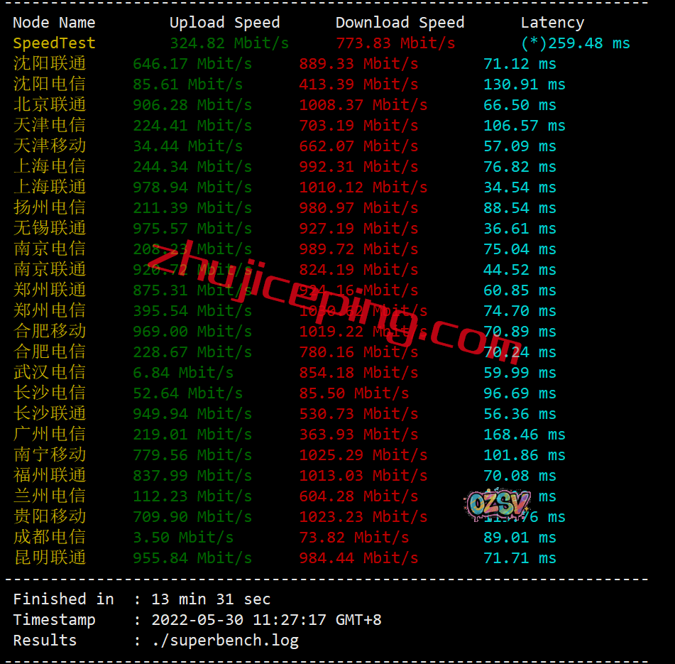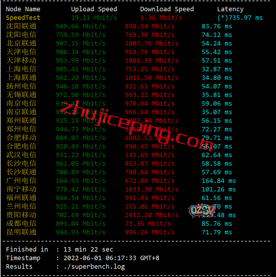 给大家用speedtest.net在国内三网的多个节点跑一下小鸡的上行、下行带宽,具体数据: