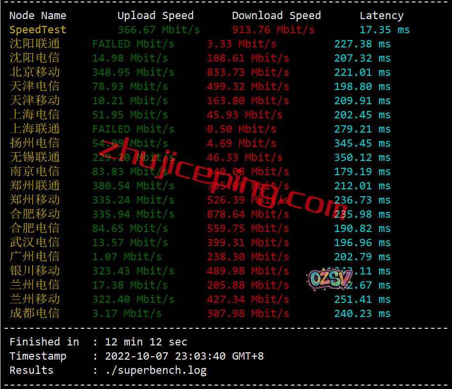 用speedtest.net的国内三网不同节点来测试下看看能跑多少的上行和下行,具体结论: