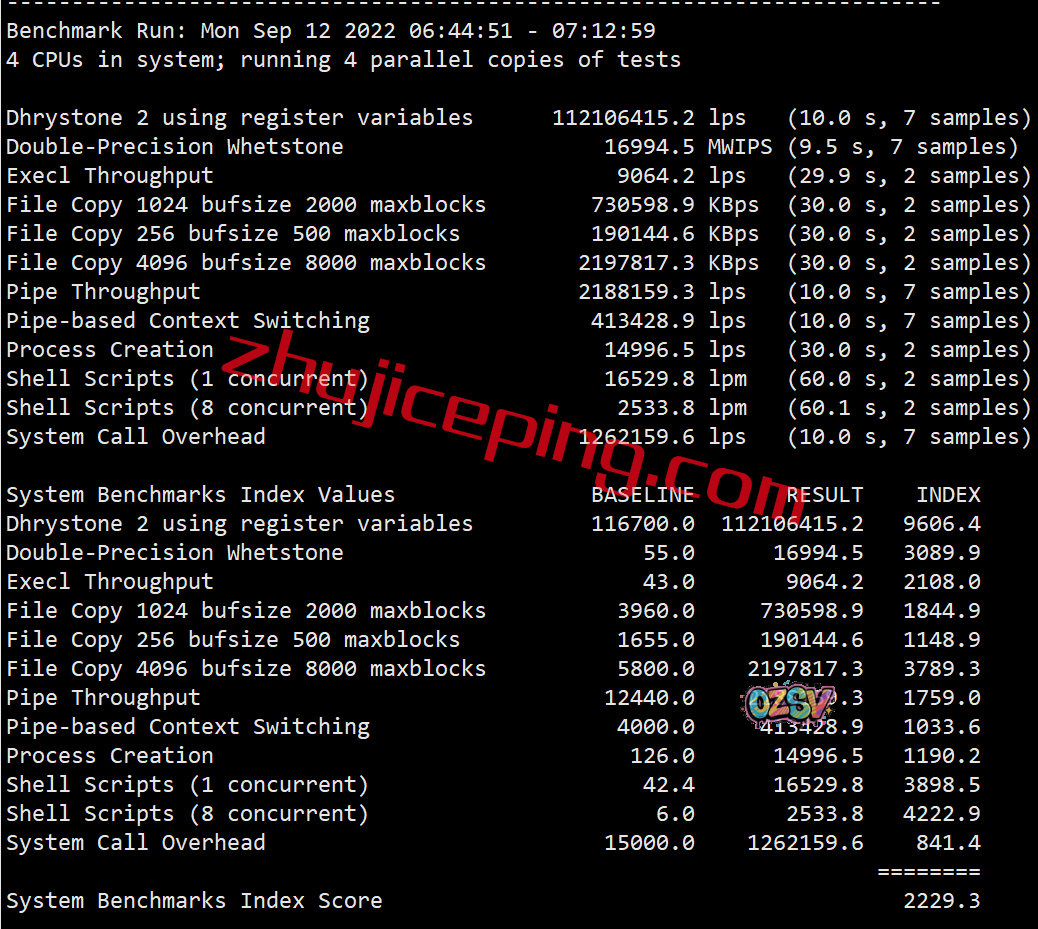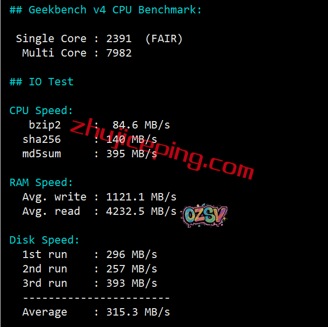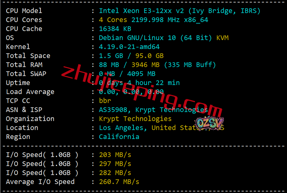 本次测试用的是4G内存、4核的VPS,CPU主频大致是2.2GHz,从图中可以看到是Krypt,当前I/O大致是260MB/S,站长开启了BBR: