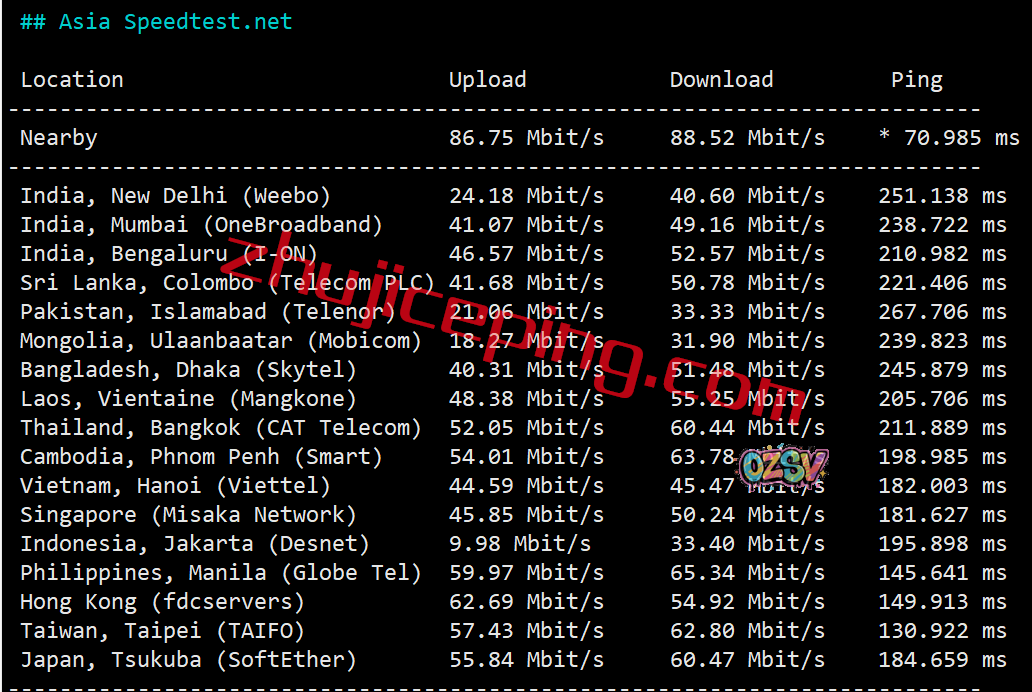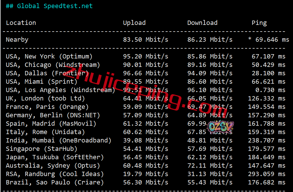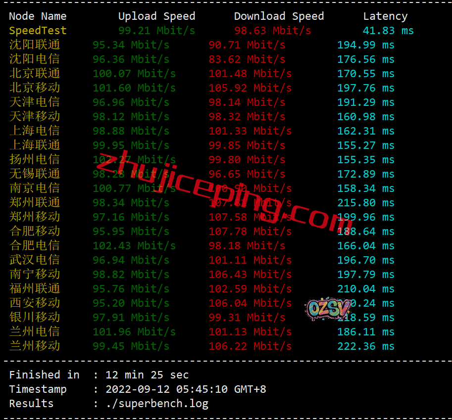 VPS默认是100Mbps带宽,我们用speedtest.net在国内的三网不同节点来测试下上下行网络带宽,看看可以跑到多少吧?数据如下: