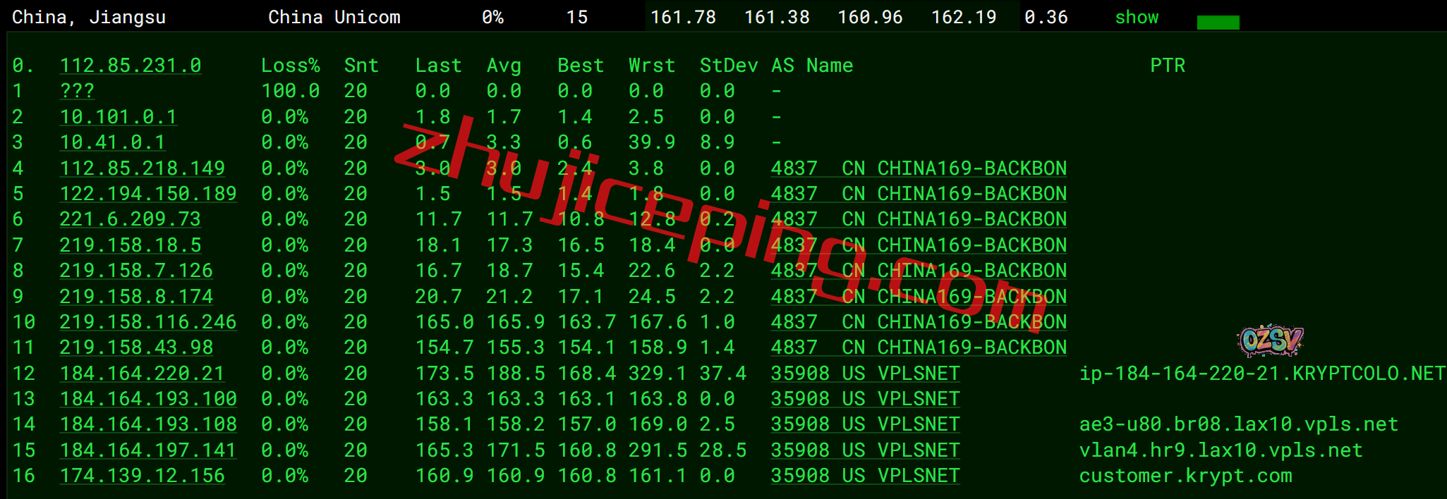 网络这块儿,回程没有看到CN2,只有去程有,经过咨询官方得到的回答就是只有中国去程是走CN2… 电信、联通回程全是走的联通AS4837直连回国,移动走自己的链路也是直连回来。