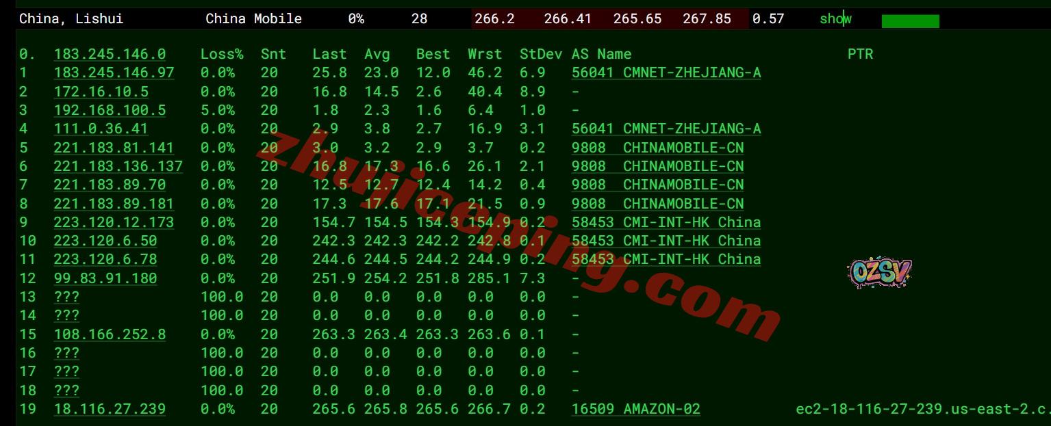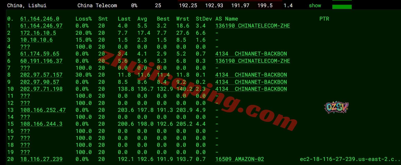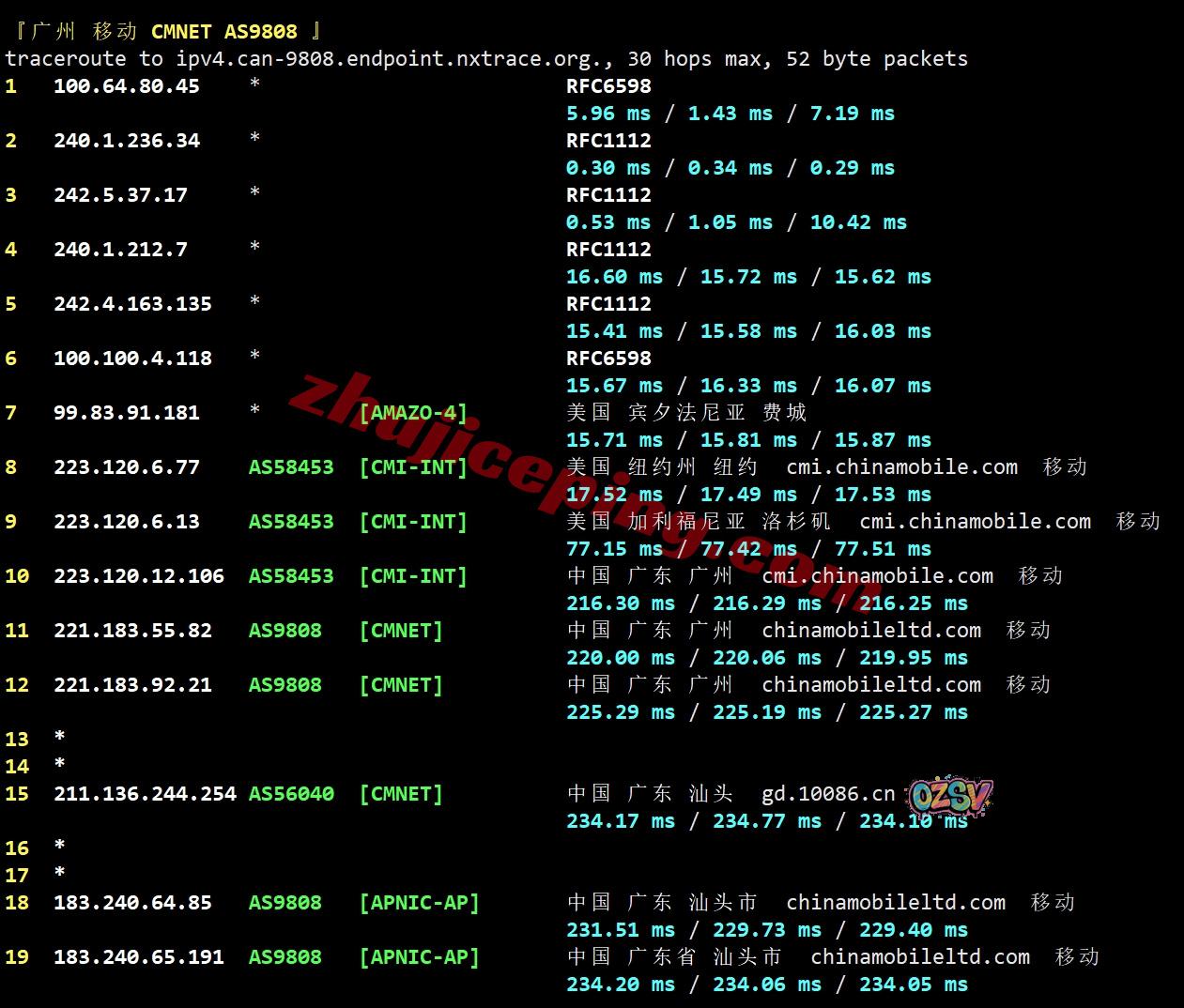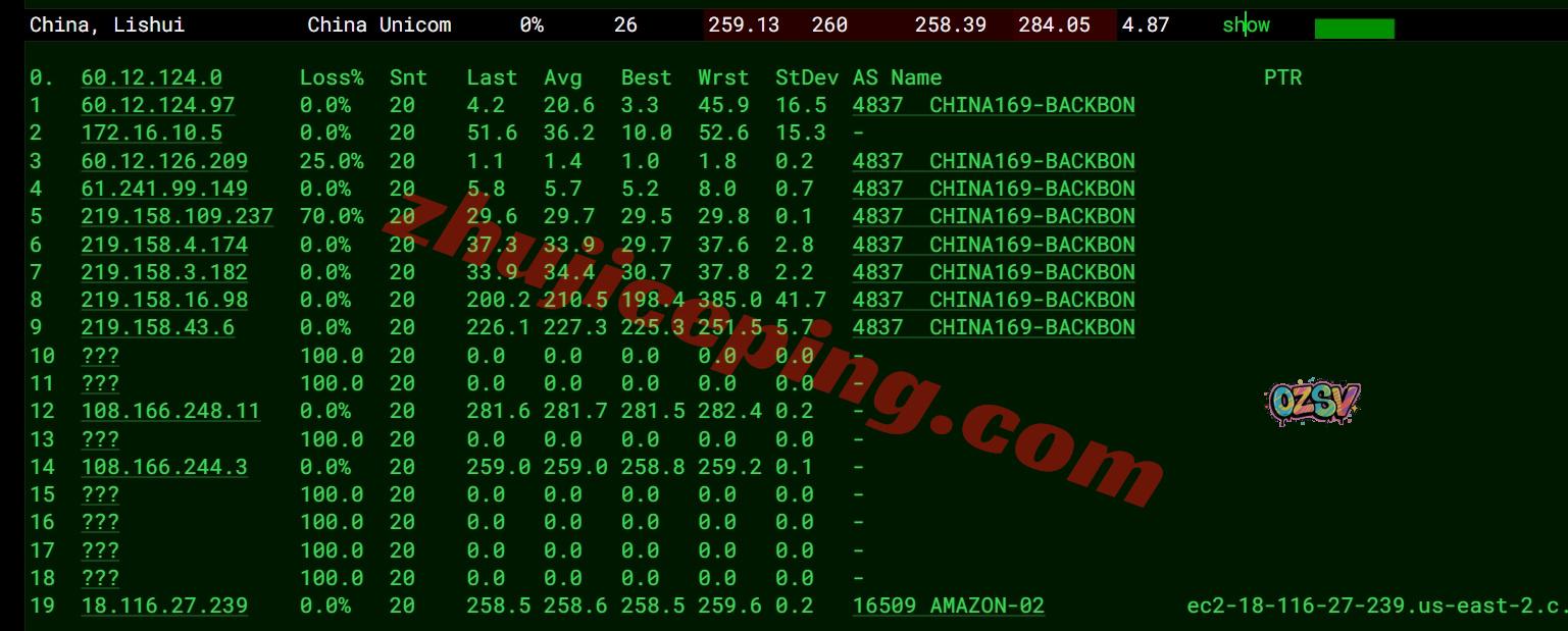 移动去程:直连移动美国西雅图节点然后去移动纽约节点然后接亚马逊内网去俄亥俄州
