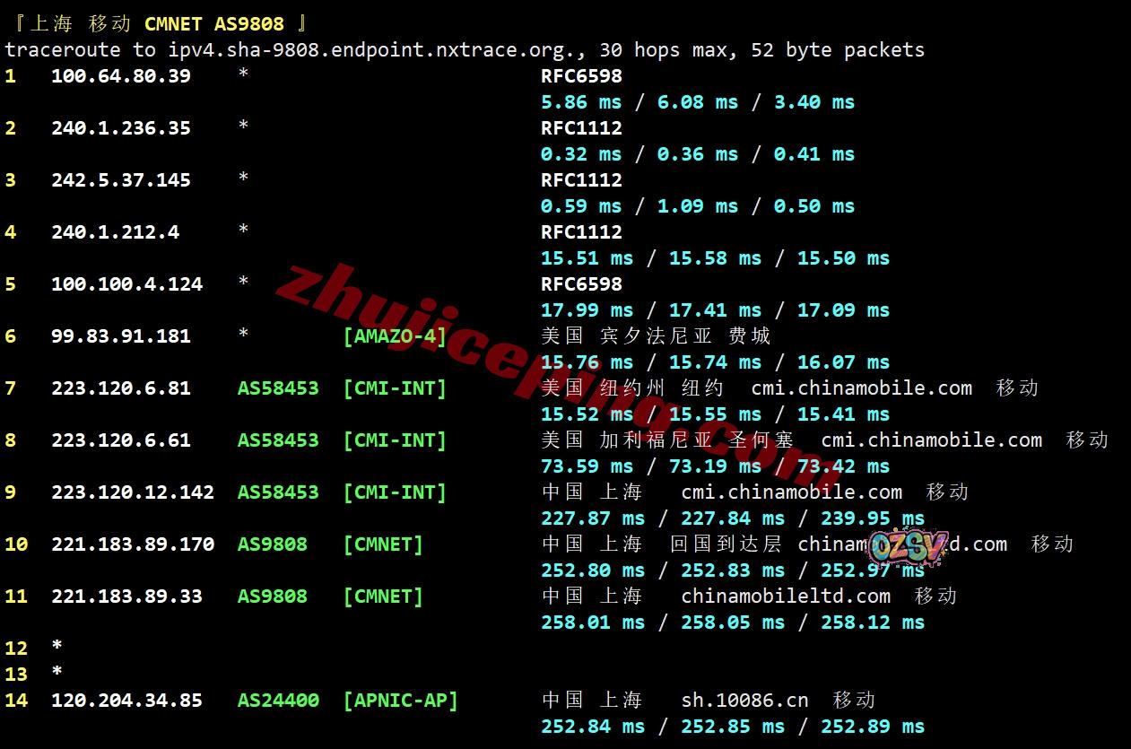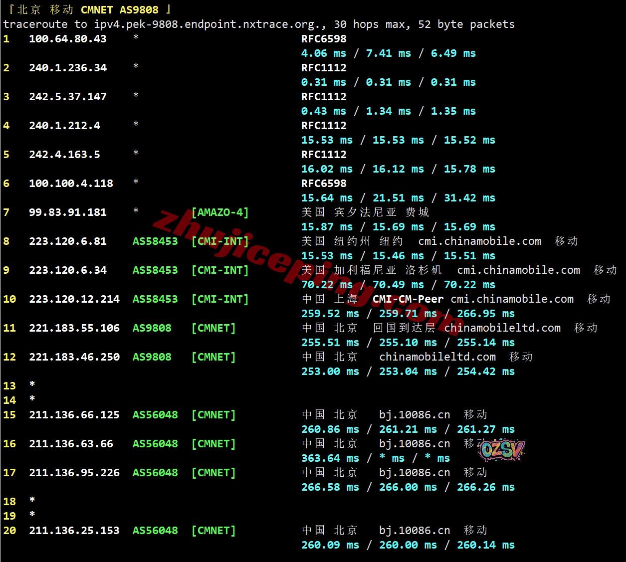 移动回程:亚马逊内网到并夕法尼亚,然后接移动美国纽约CMI节点,接着去移动美国了洛杉矶节点/圣何塞,然后直连回国