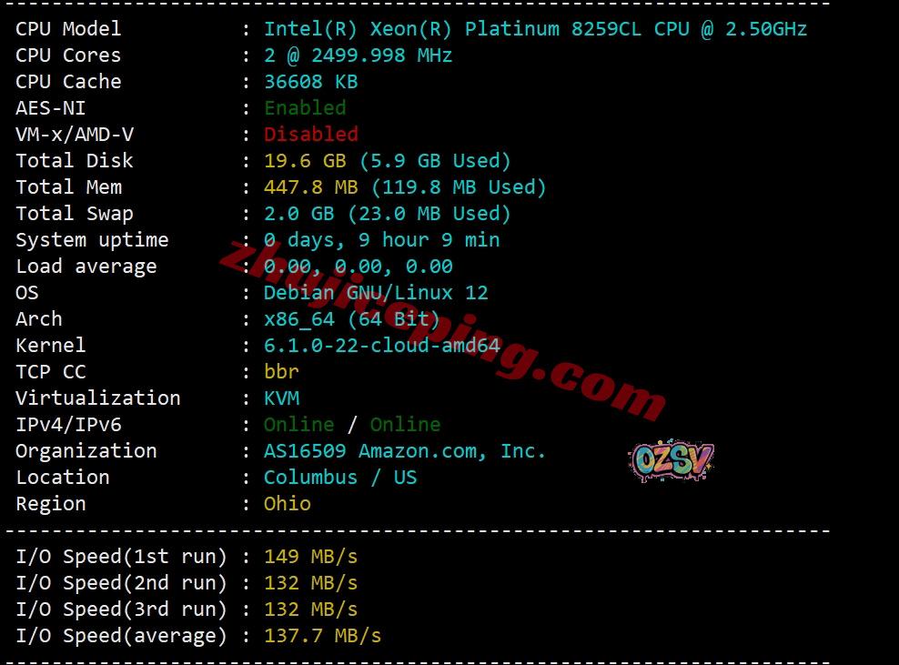开了个云,CPU貌似是Intel Xeon Platinum 8259CL(24核、48线程、主频2.5GHz、加速频率3.5GHz),IPv4和V6都支持,亚马逊自己的网络,归属地美国Ohio(俄亥俄州)Columbus(哥伦布市),当前I/O大致137MB/S: