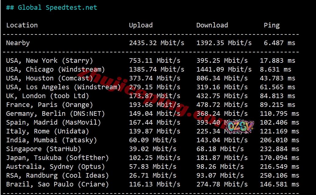 speedtest.Net部分国际节点的带宽上下行测试数据:
