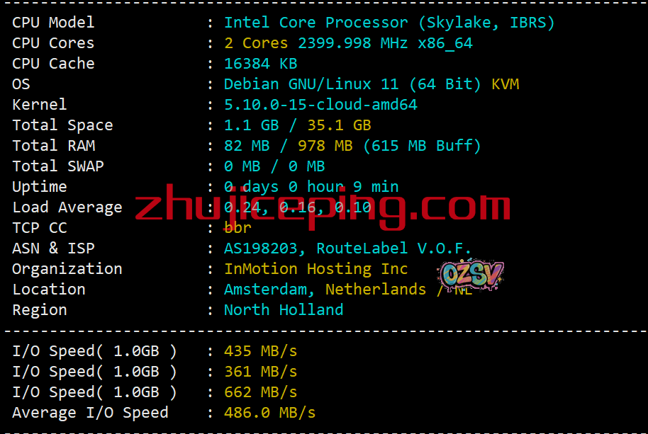 荷兰数据中心当前还是Intel的CPU,具体型号不知道,但是主频是2.4GHz,大家可以自行盲猜一下!站长习惯性喜欢启用BBR,我们可以看到当前硬盘I/O大致在486MB/S的样子: