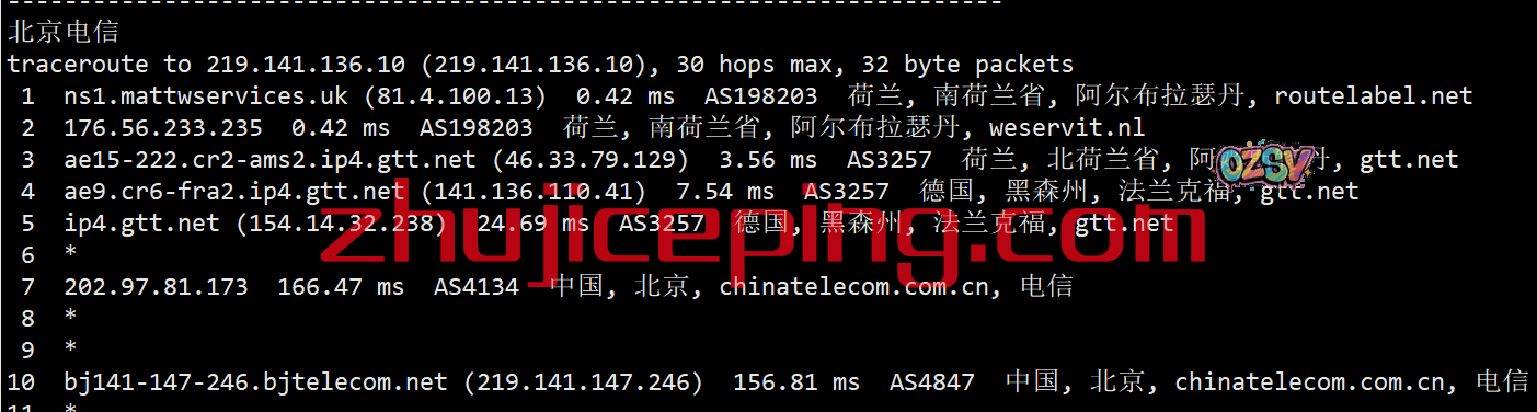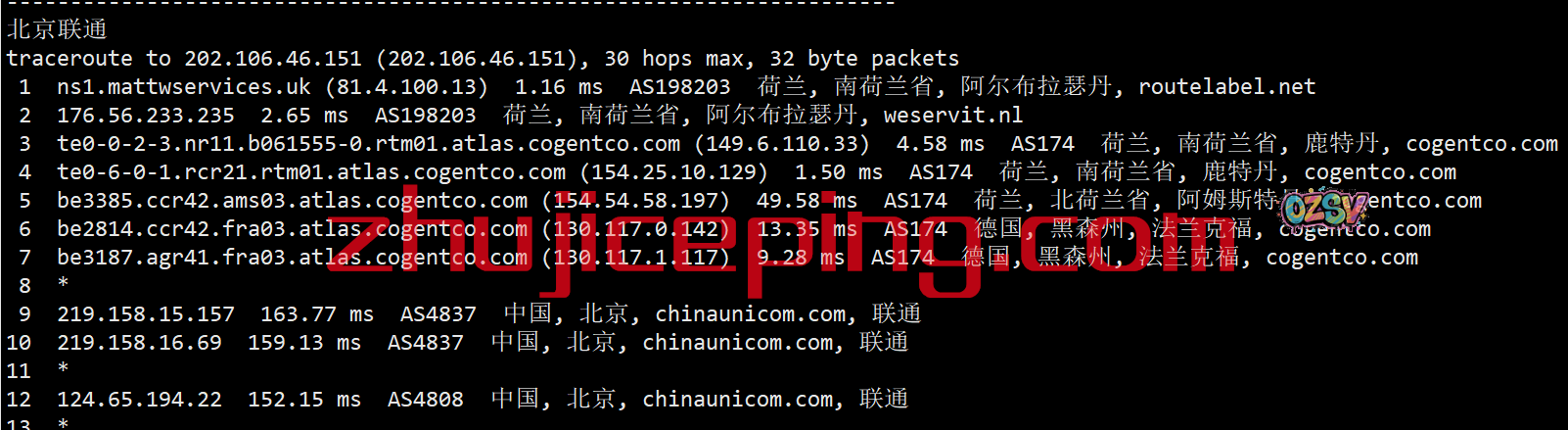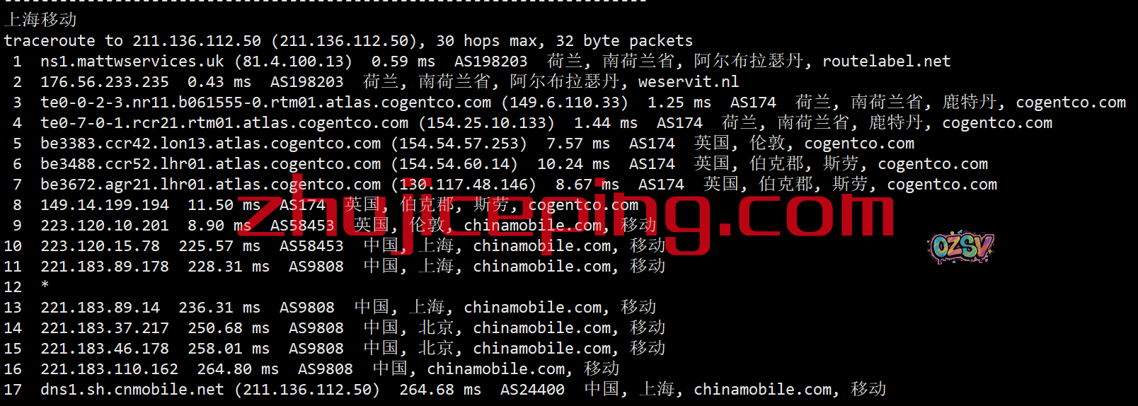 北京/上海方向:从荷兰到英国,然后都是从移动在英国节点直接回国