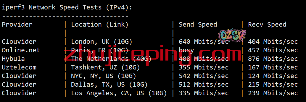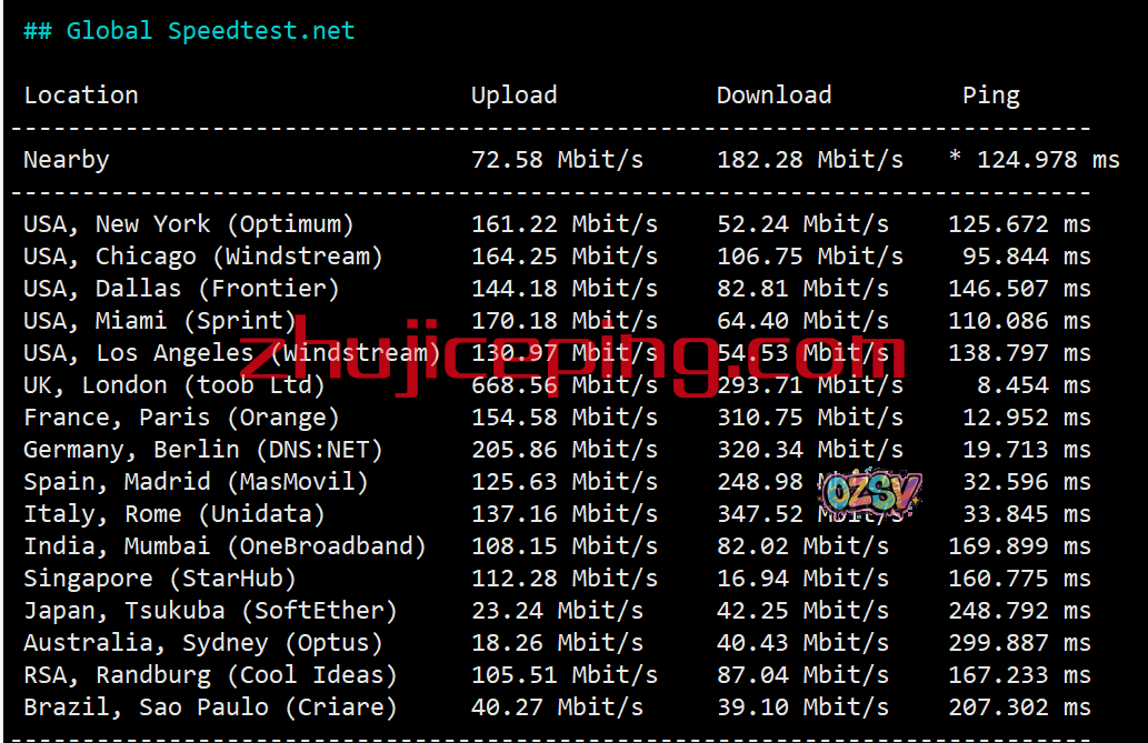 来看看小鸡能跑多少的上行和下行吧,用speedtest.net的不同节点来测试: