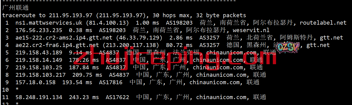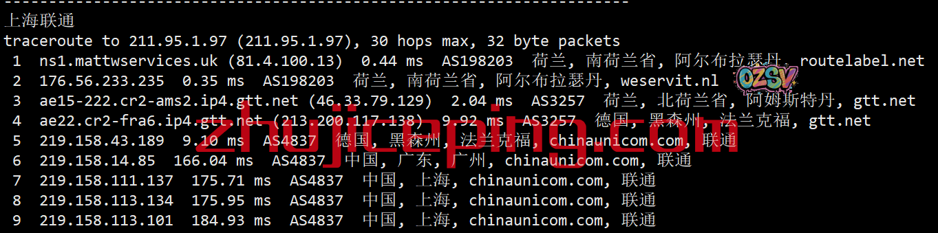 上海/广州方向:走GTT到德国,然后从联通在德国节点走AS4837直连回国