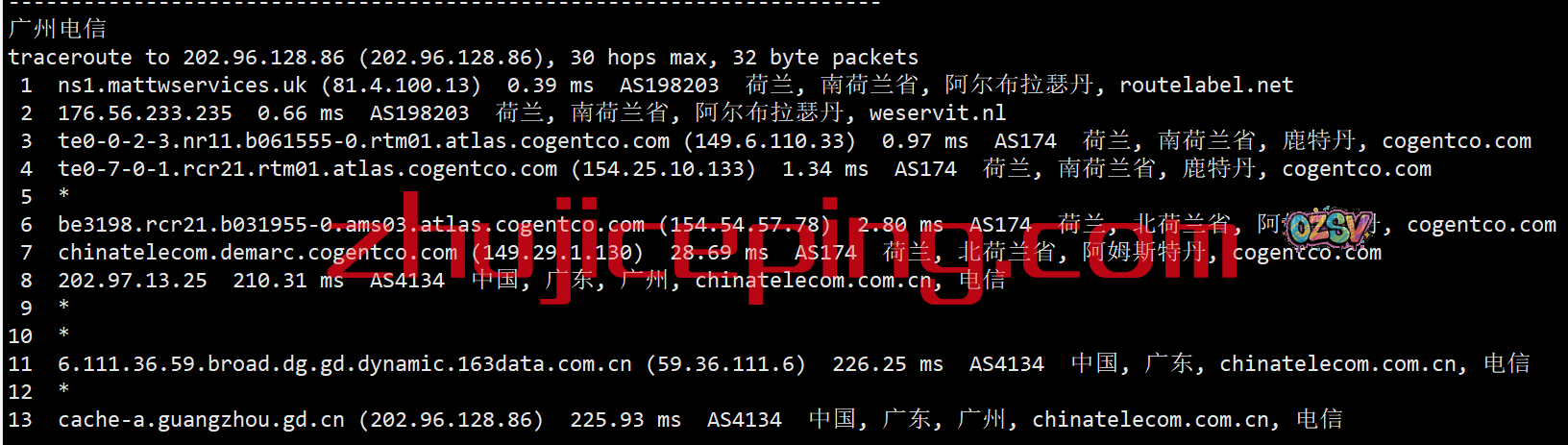 上海/广州方向:走cogent,然后从中国电信和cogent在荷兰的peer处直接回国