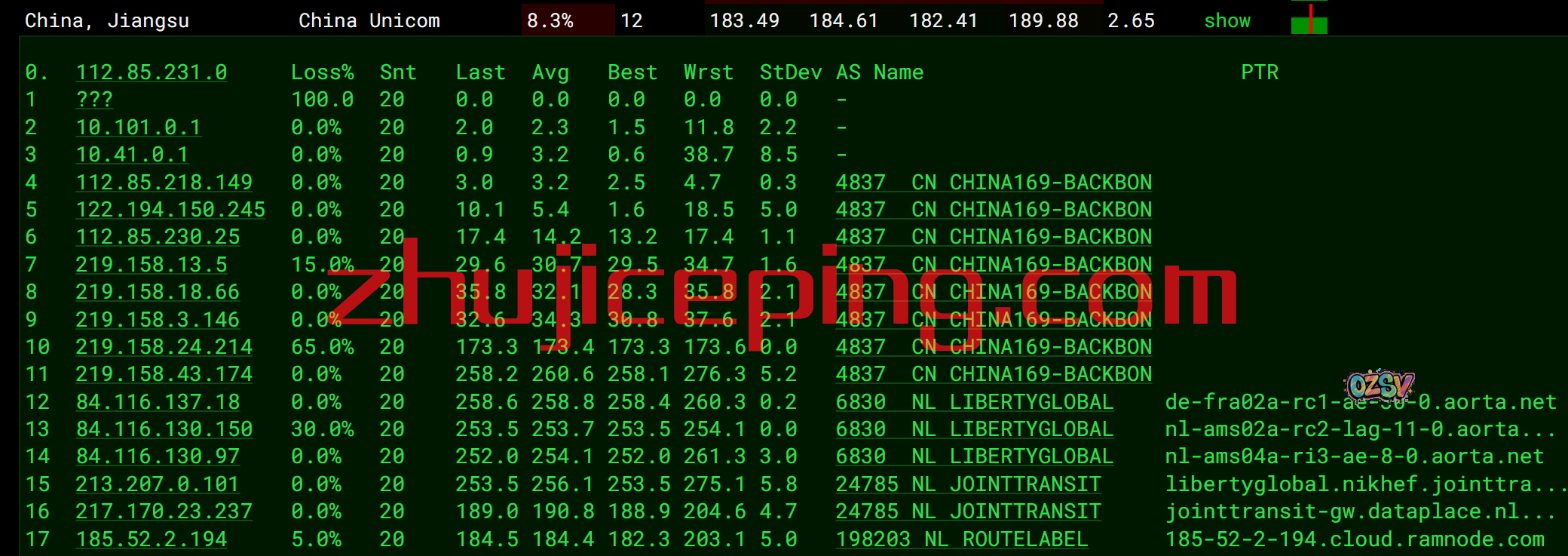 联通去程,联通骨干对接aorta.net直接到荷兰: