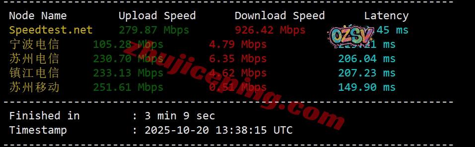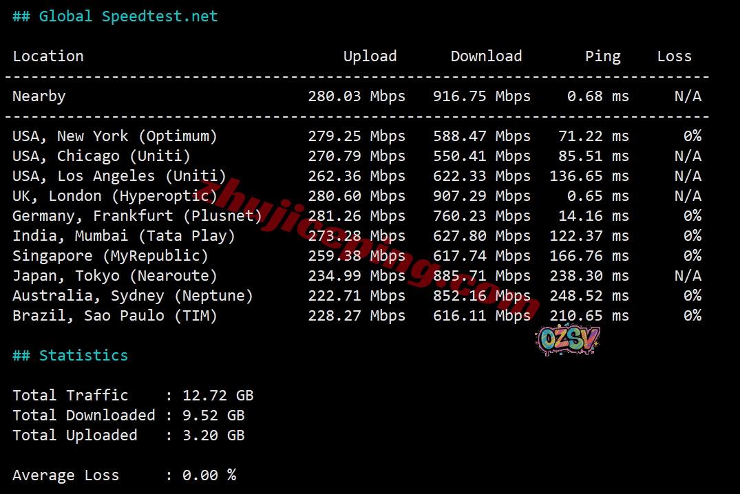 SpeedTest.Net的部分国际节点的带宽上下行+延迟测试数据: