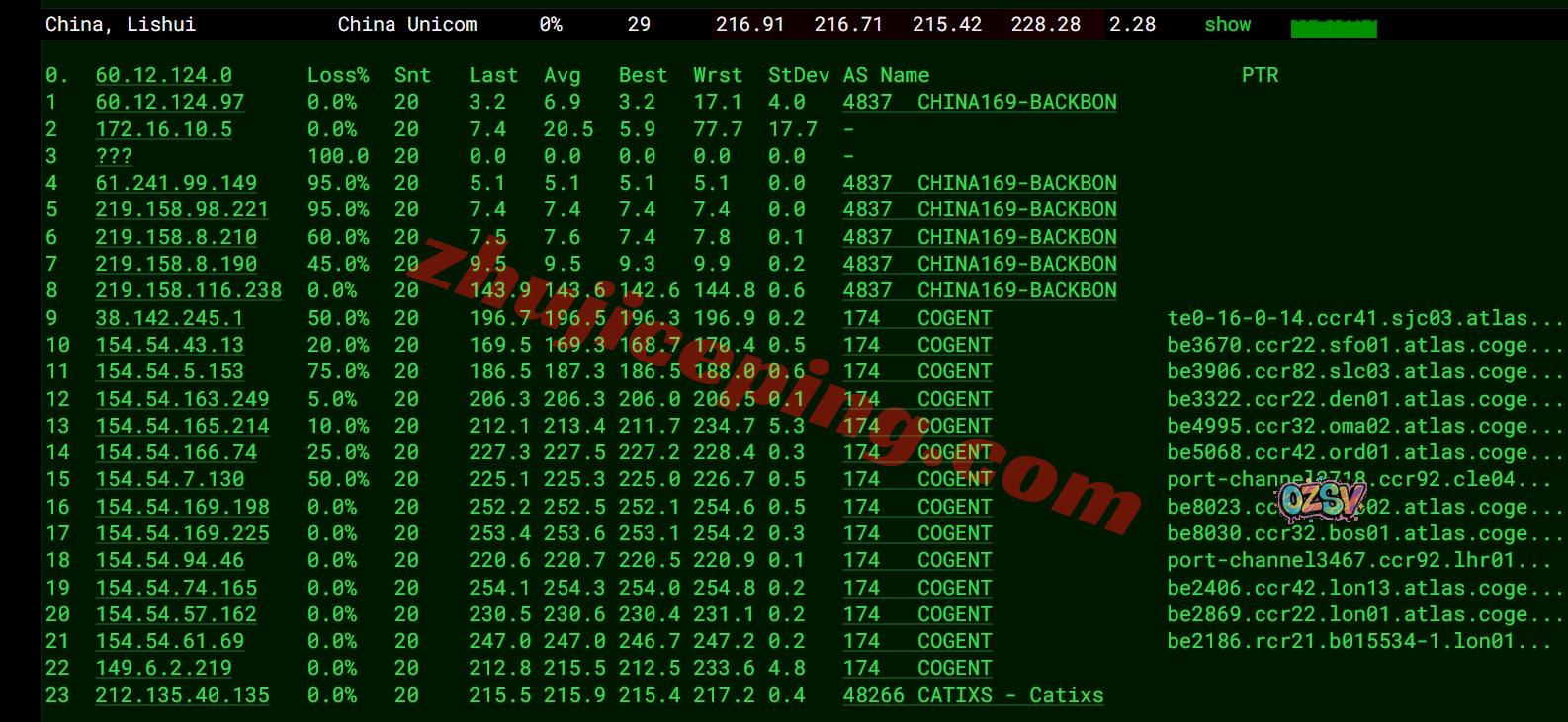 联通去程:直连联通美国圣何塞节点然后接cogent一路向东从东海岸出海去英国伦敦