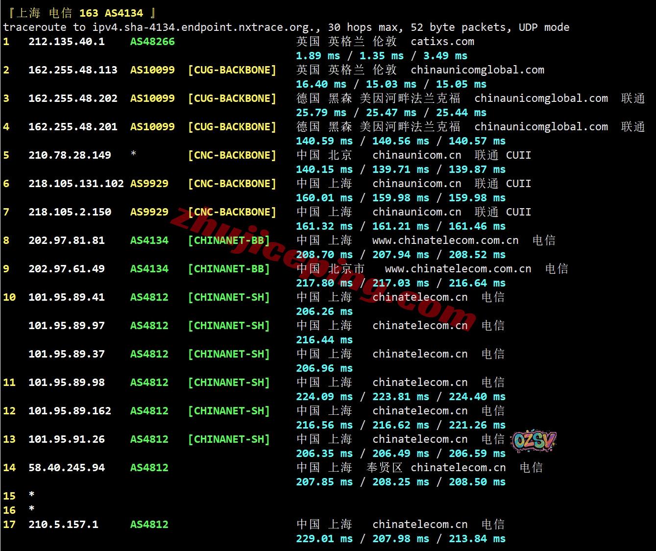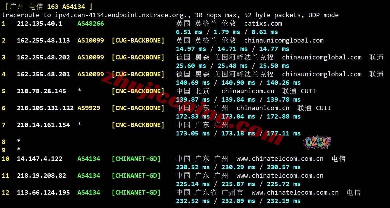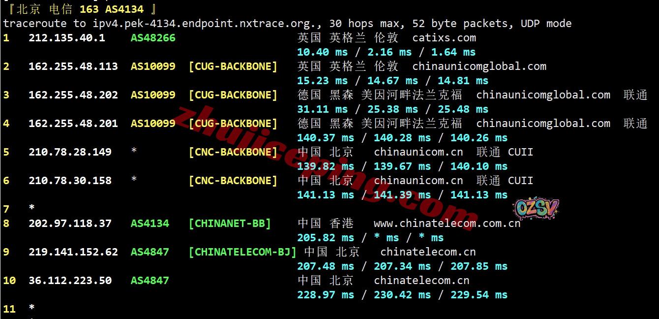 电信回程:从英国接AS10099经过德国后+AS9929高端线路回国