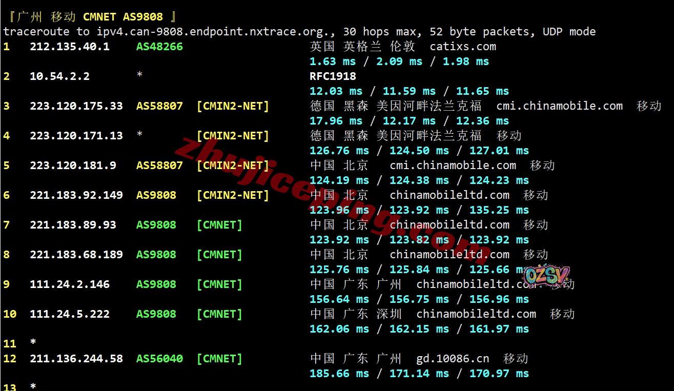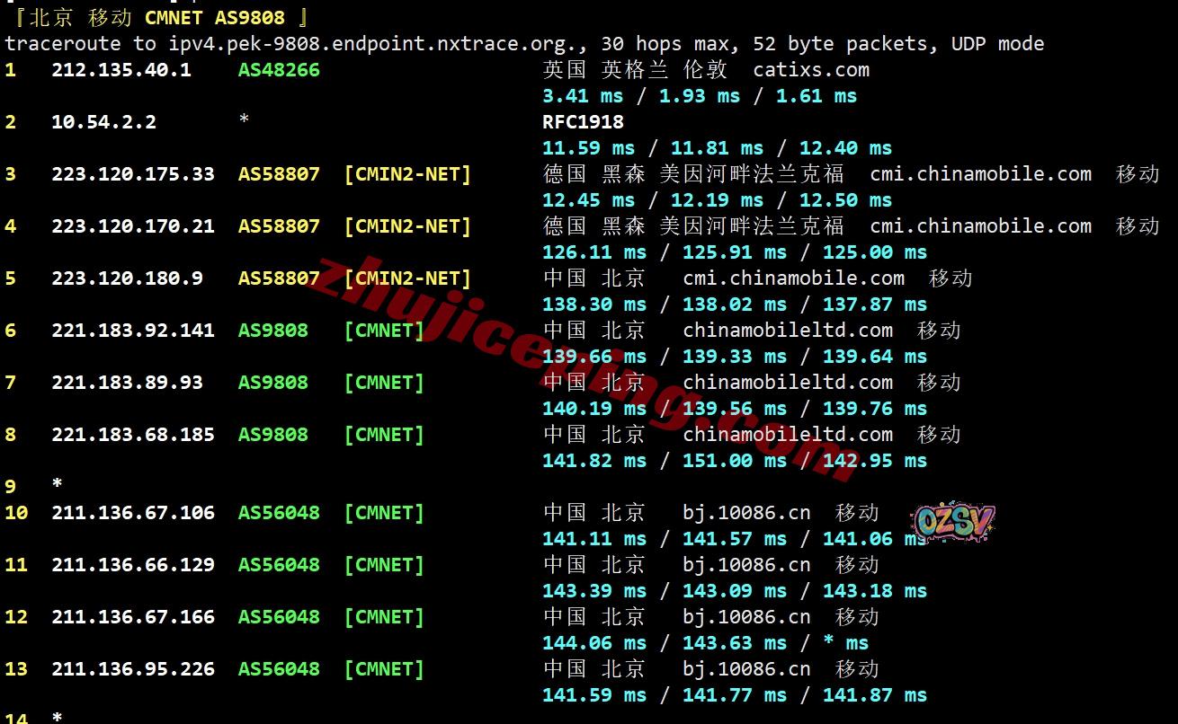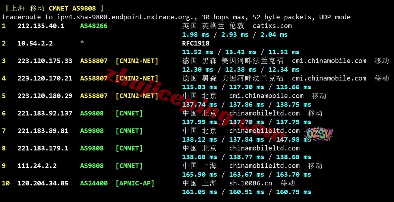 移动回程:英国去德国的路由隐藏了(内网),然后直接从德国接移动CMIN2高端线路直接回国