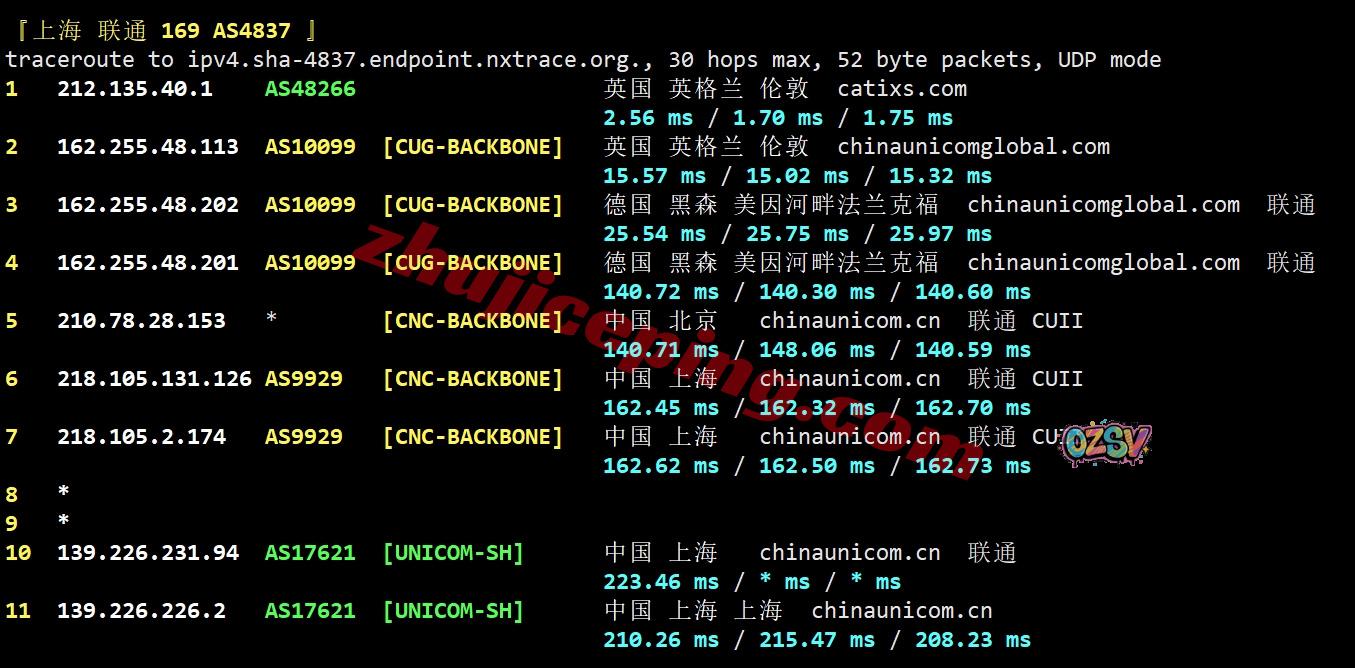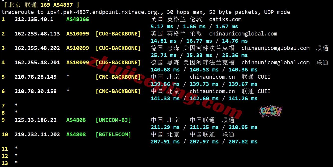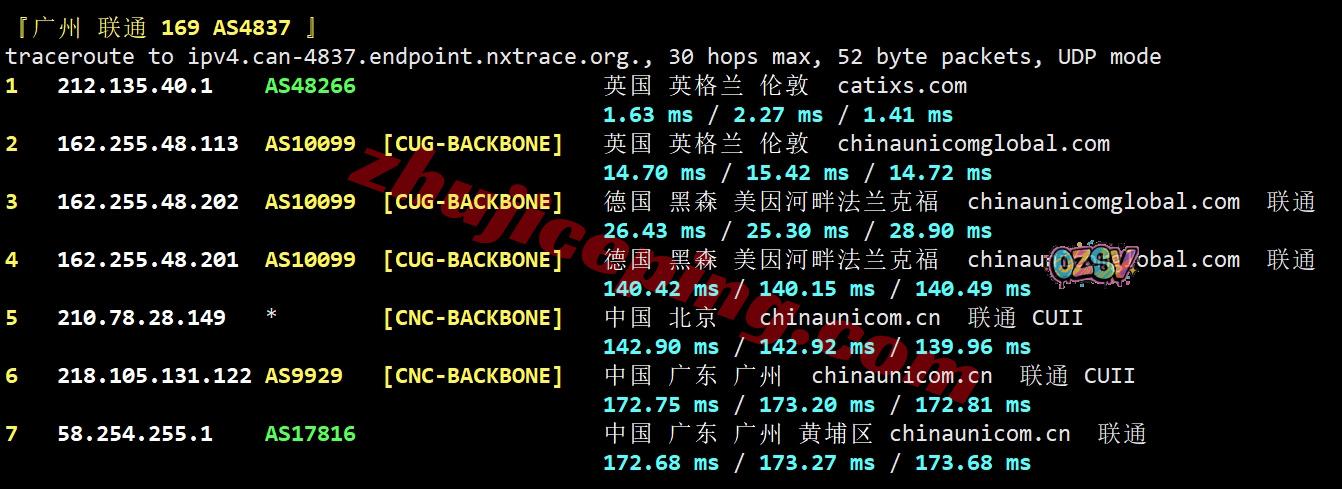 回程:电信和联通是AS10099到德国后接AS9929高端线路回国;