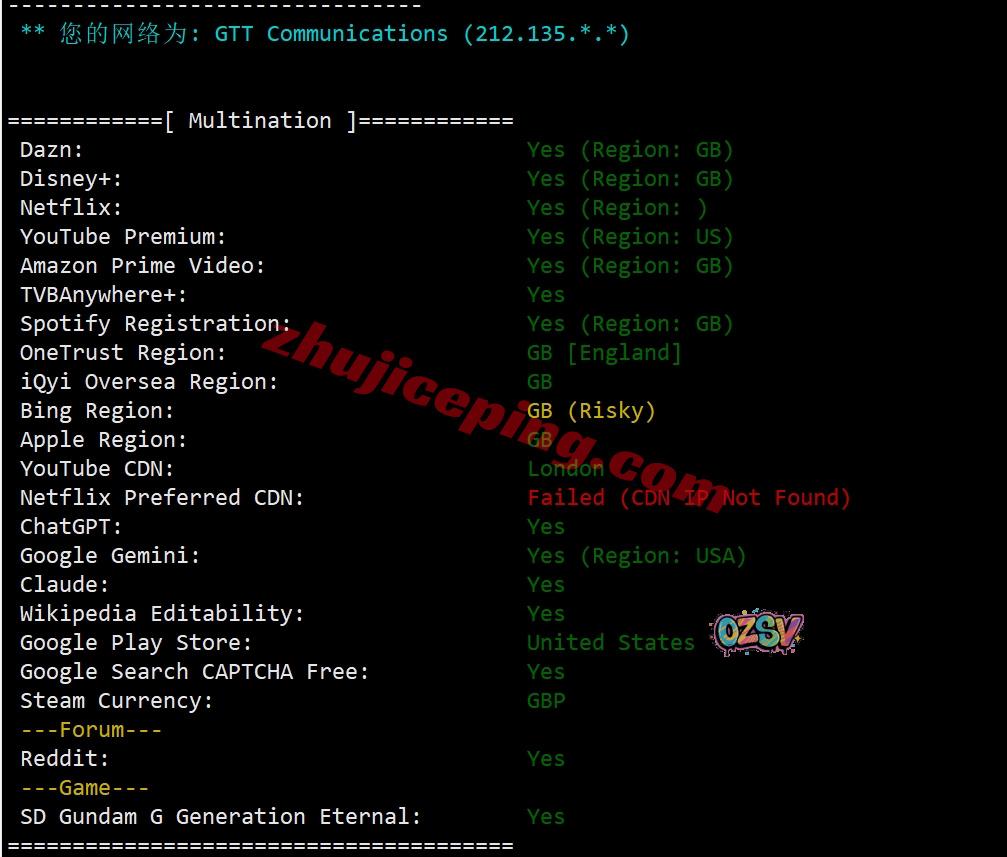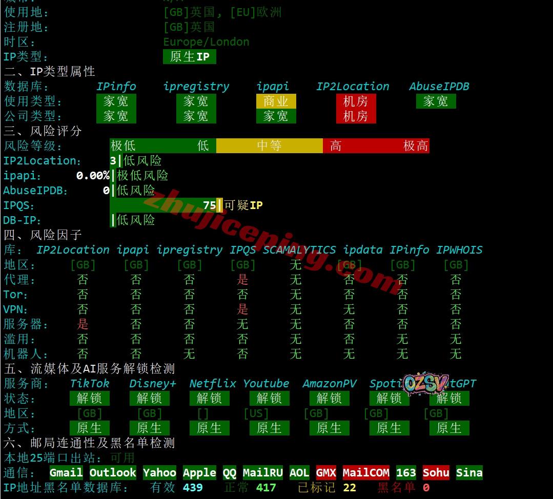 IPv4为英国原生IP,解锁效果非常好,部分数据库判断为双ISP属性;