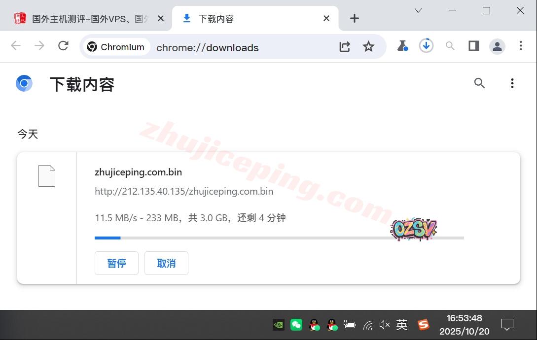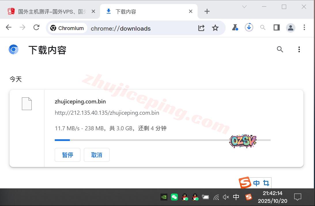 站长广州联通家宽用Chrome下载存放在测试VPS上的文件, 大致的下载速度如下: