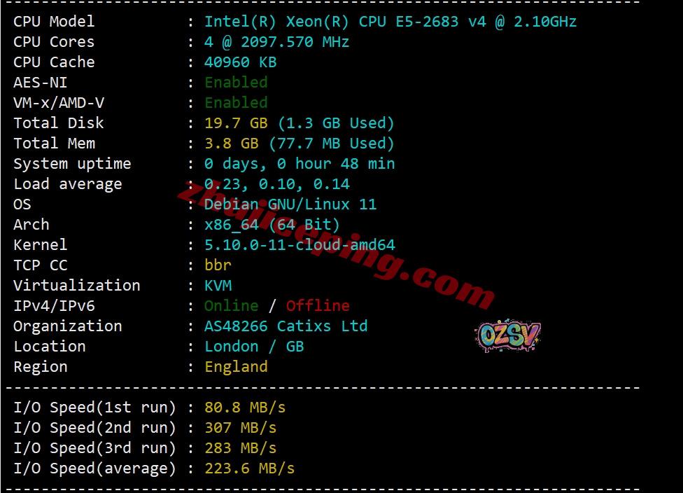 服务器用的双路CPU具体型号为e5-2683v4(32核、64线程、主频2.1GHz、加速频率3.0GHz),站长启用了BBR,不支持IPv6,上游是AS48266,归属地英国伦敦,当前实测I/O结果为223MB/S: