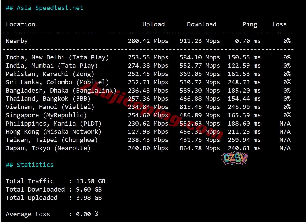 SpeedTest.Net的部分亚洲节点的带宽上下行+延迟测试数据: