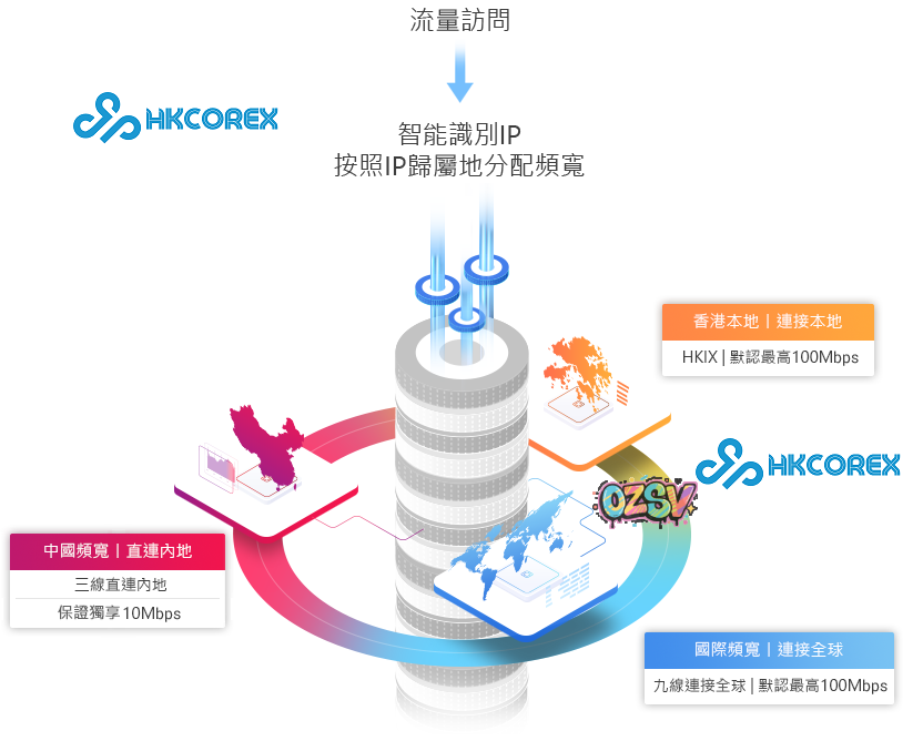 为了有效促进企业内地业务以及国际业务之间的数据互联,HKCOREX正式推出三合一带宽服务器,一台服务器同时拥有最少3种带宽接入,在特有的网络架构支持下,三合一带宽服务器方案为企业连接全球提供助力。除了能够提升企业目标客户的访问体验之余,还可令企业业务穿梭世界各地,持续航行。