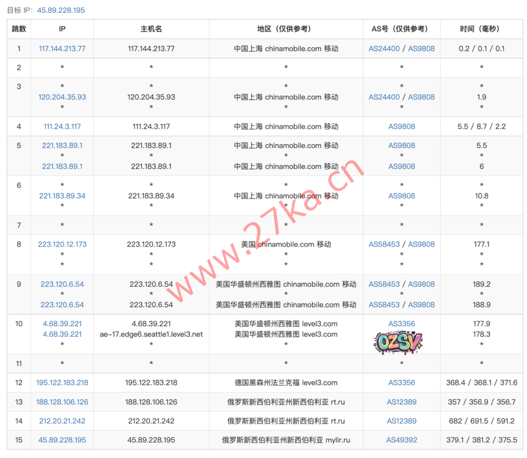 5、JustHost俄罗斯新西伯利亚Rostelecom机房VPS电信、联通、移动三网去程线路怎么样?直不直连?从国内三网去程路由追踪测试结果来看,电信联通去程直连、移动绕美欧洲再到俄罗斯。