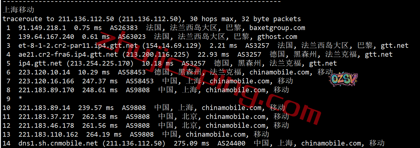 上海方向:走GTT经过德国,从移动法兰克福节点直接回国