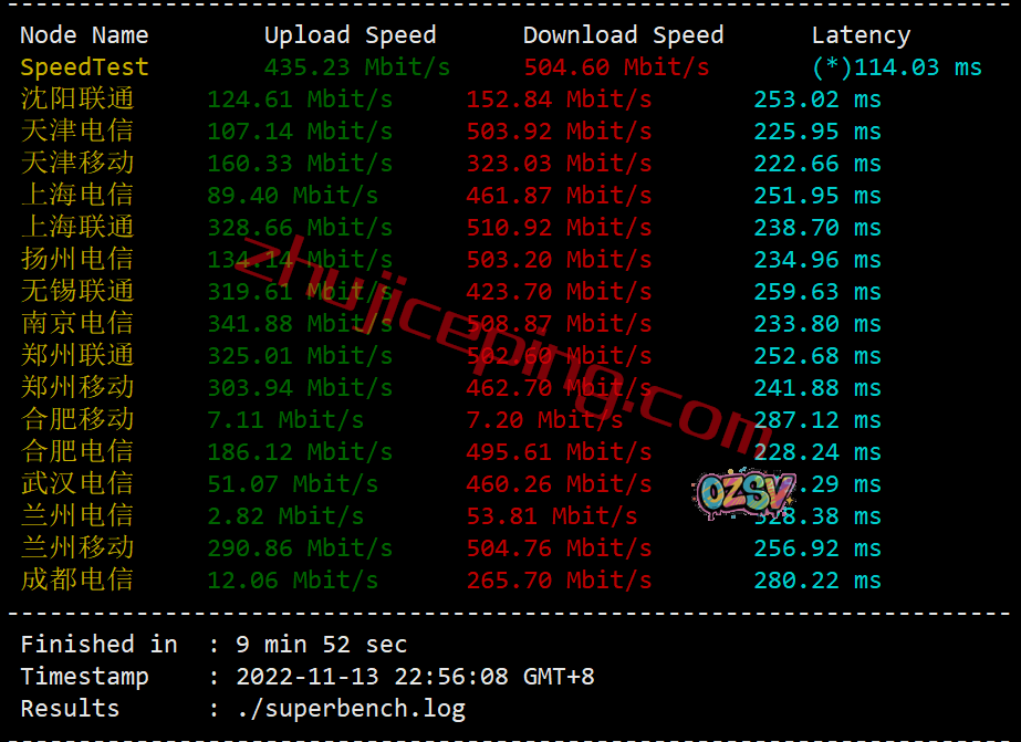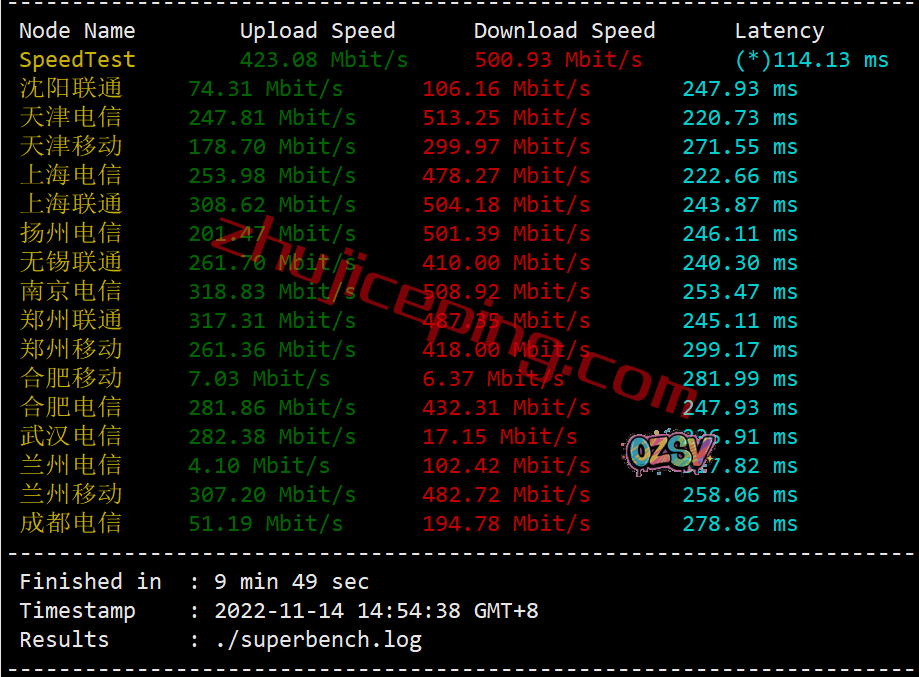站长开的是500Mbps带宽的小鸡,试试在国内能冲到多少上行和下行,下方为speedtest的国内节点测试数据: