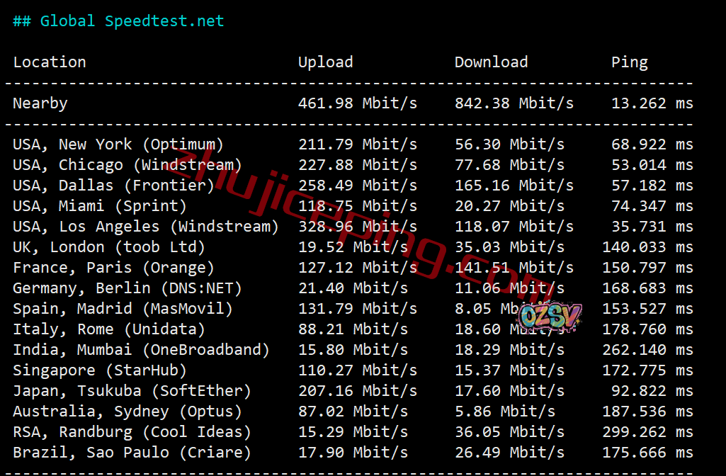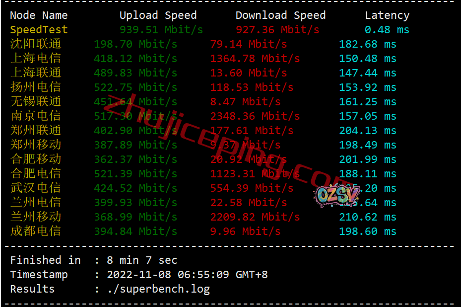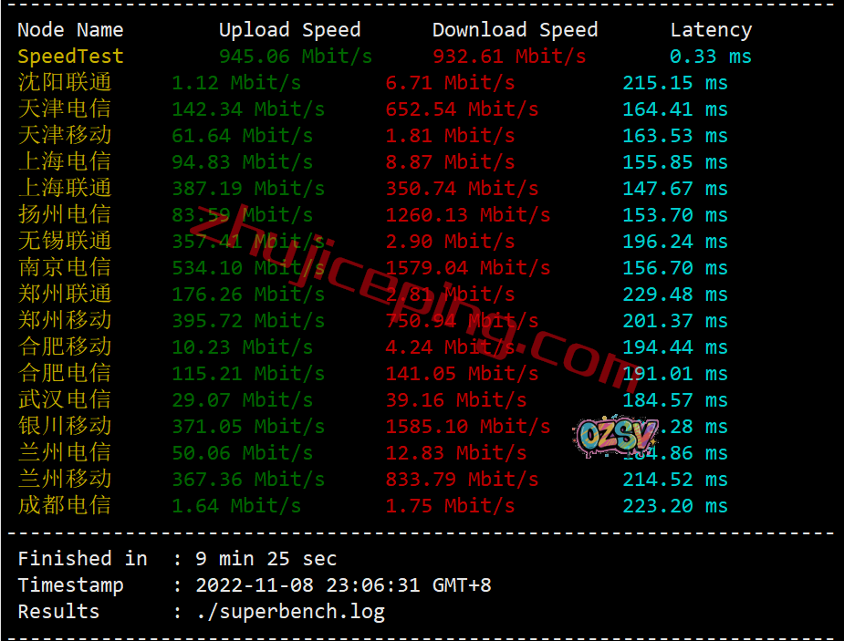 默认1Gbps带宽,我们用speedtest.net在国内的三网不同节点跑一下上下和下行,看看最高可以冲到多少?大致数据如下: