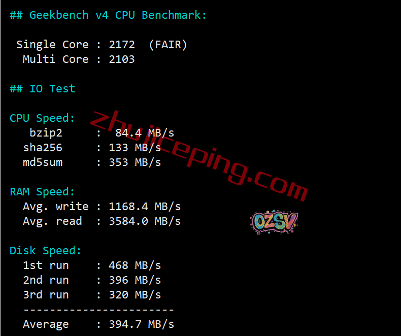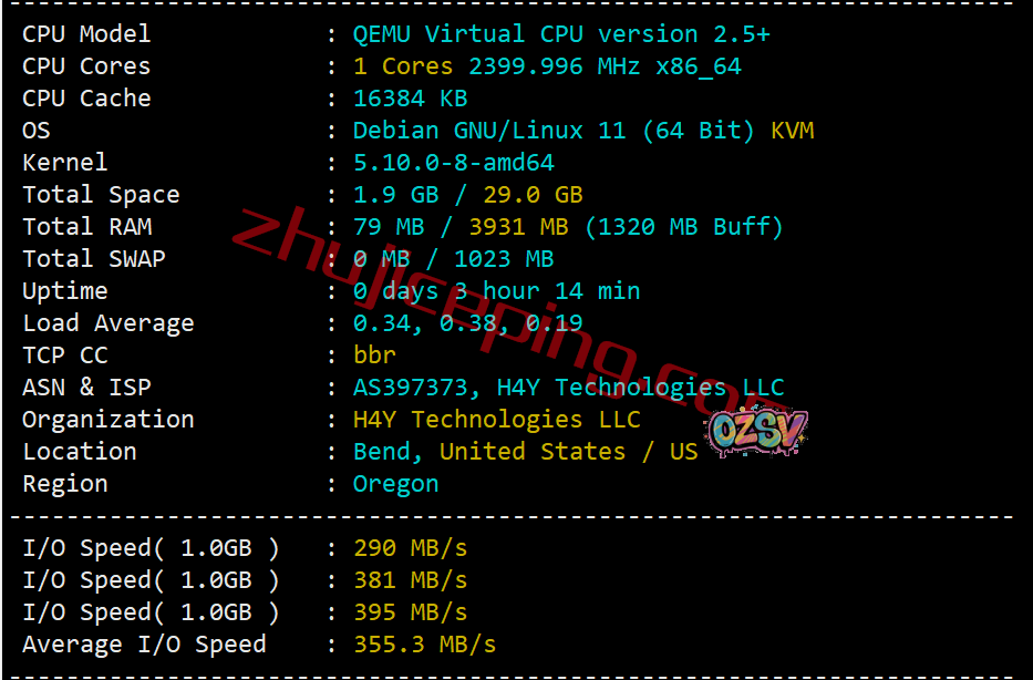 VPS服务器所用的CPU型号未知,大致主频2.4GHz,H4Y(也就是iwebfusion)自己的IP,当前硬盘I/O大致355MB/S,站长启用了BBR: