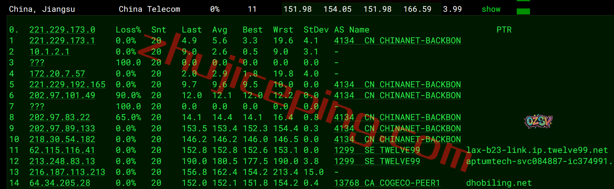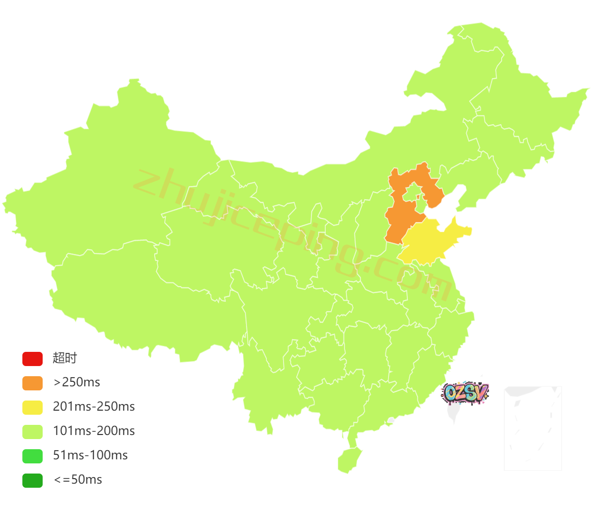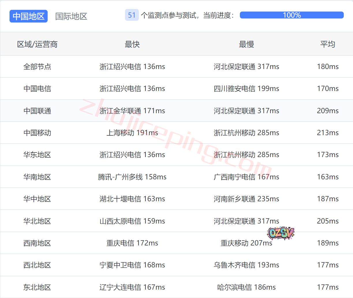 国内三网多个节点的延迟测试数据: