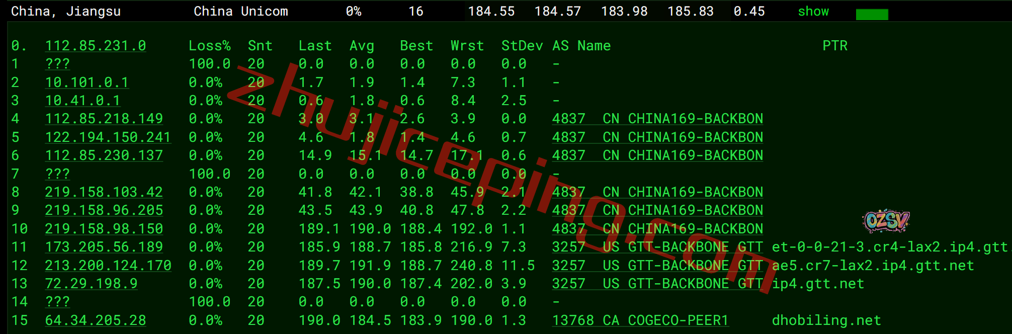 联通去程,走的是GTT线路: