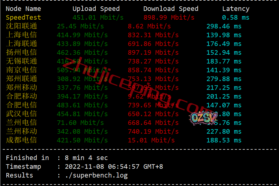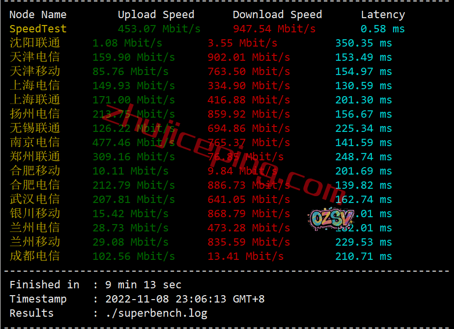 我们来看看在国内三网不同节点能跑出多高的上行和下行,大致数据如下: