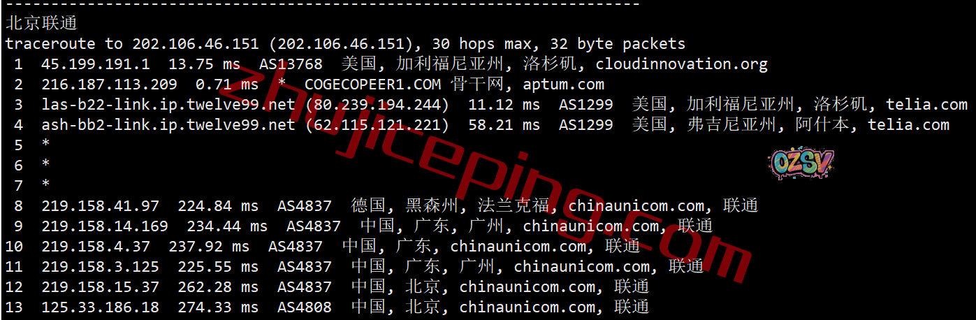 北京方向:走telia绕道了德国,然后从联通在德国法兰克福的节点直连回来