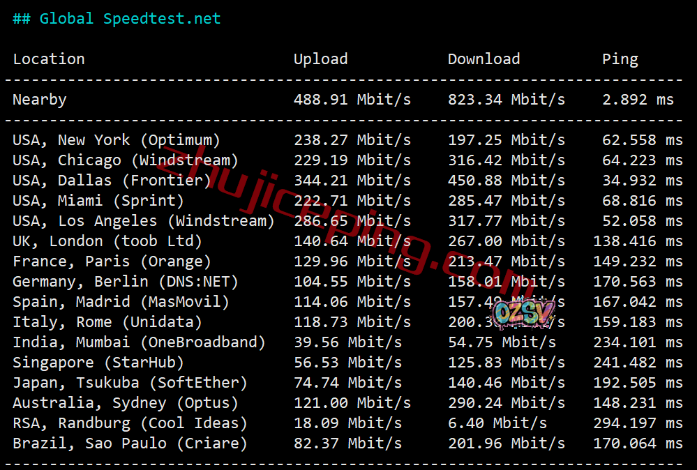 美国、欧洲、亚洲、非洲,部分节点的上下行测试数据如下: