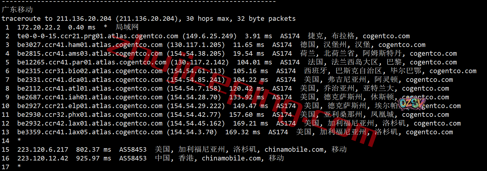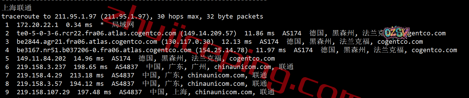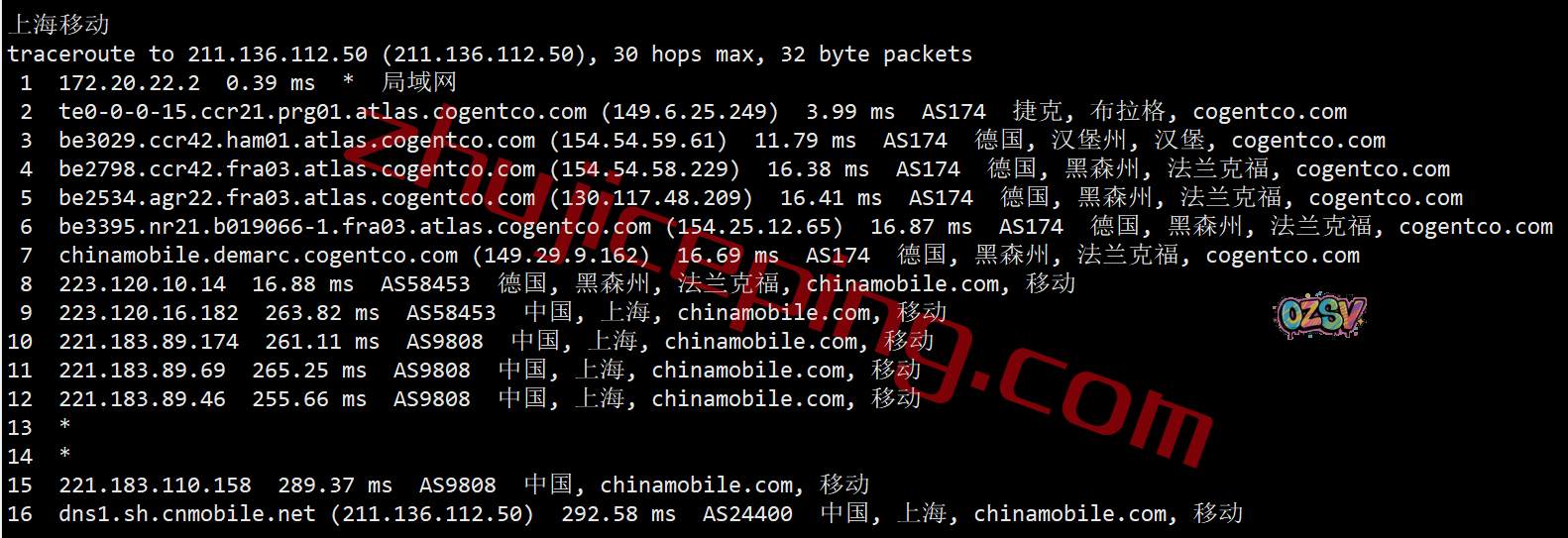 上海方向:走cogent到德国法兰克福,然后从移动在法兰克福的节点直连回国