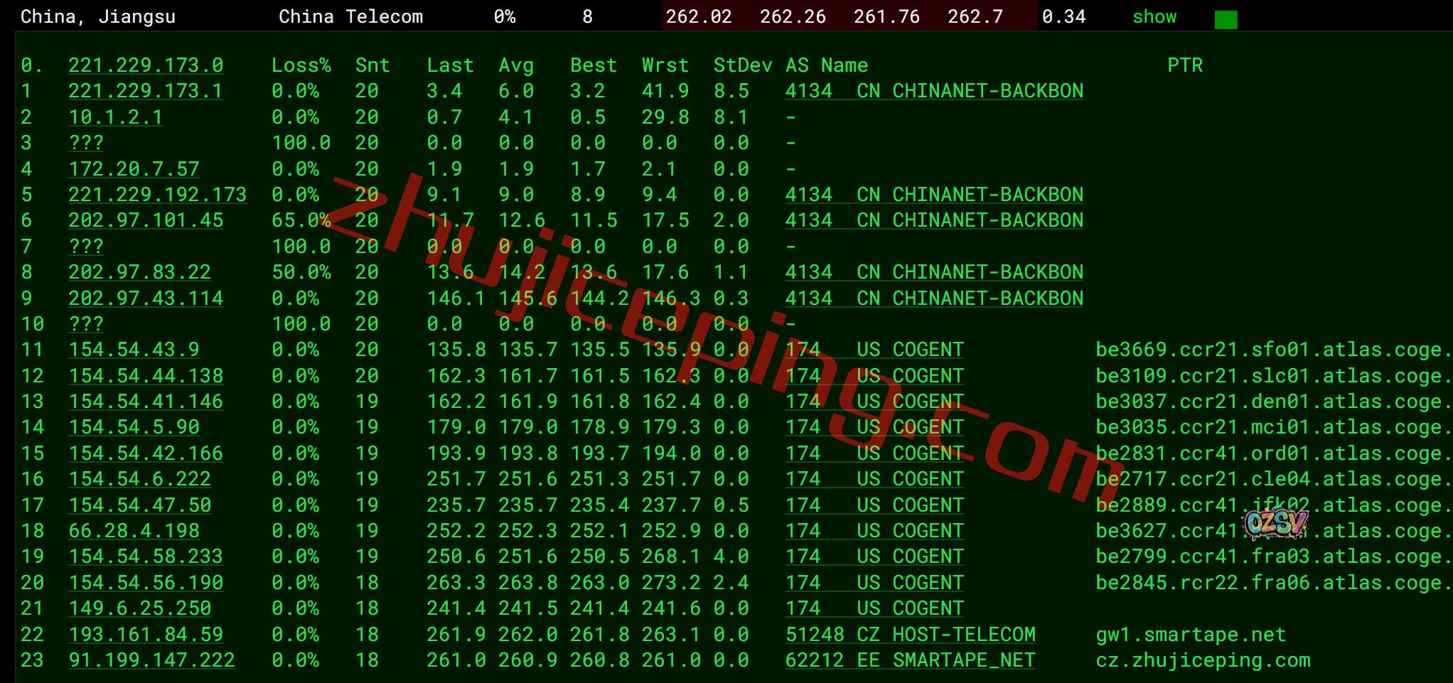 电信去程,骨干网对接cogent,从美国西海岸登录从东海岸出,然后经过法国、德国最后到捷克: