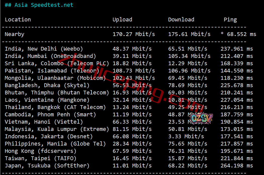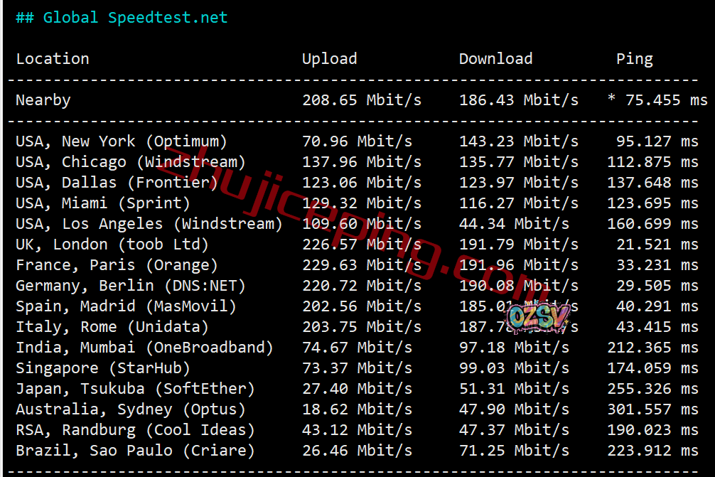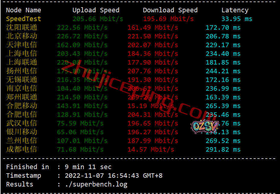 默认是200Mbps带宽,我们用speedtest在国内三网的不同节点跑一波试试看,看看最高上下行能达到多少吧?大致数据如下: