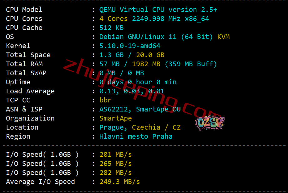 具体CPU型号未知,主频大致2.25GHz,I/O大致249MB/S,启用了BBR,smartape自己的ASN: