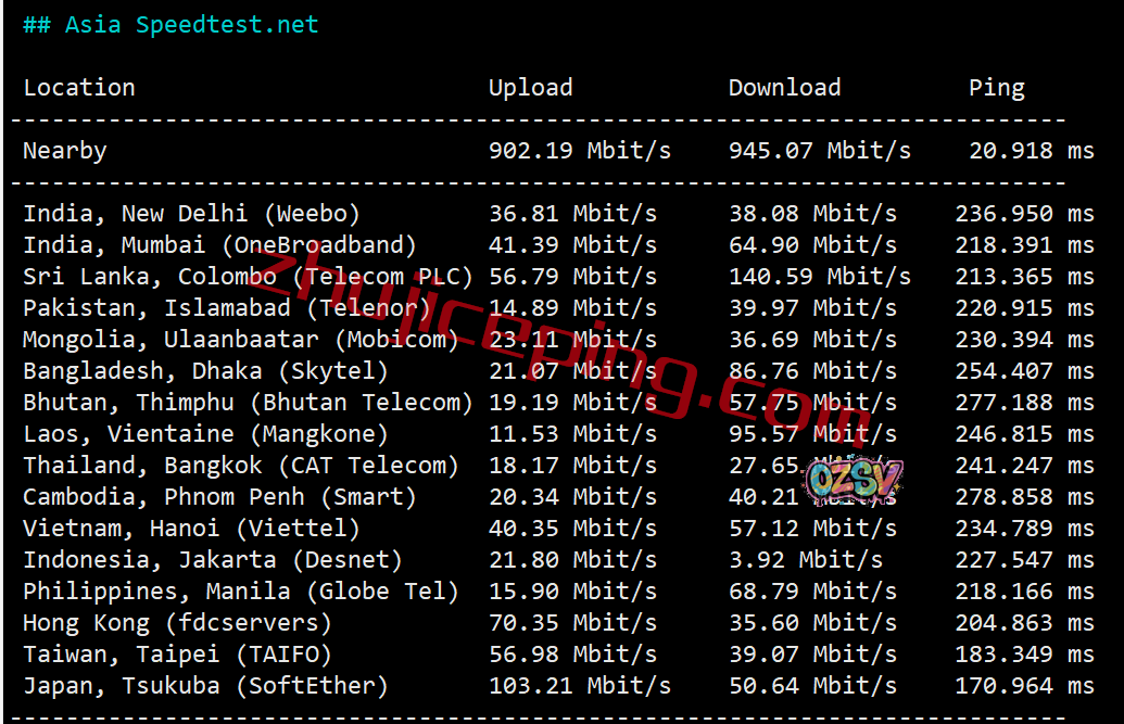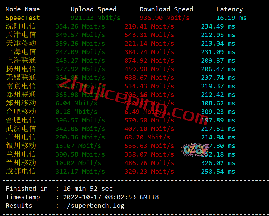 我们用speedtest.net来跑一下服务器的上行和下行带宽在国内能达到多少:
