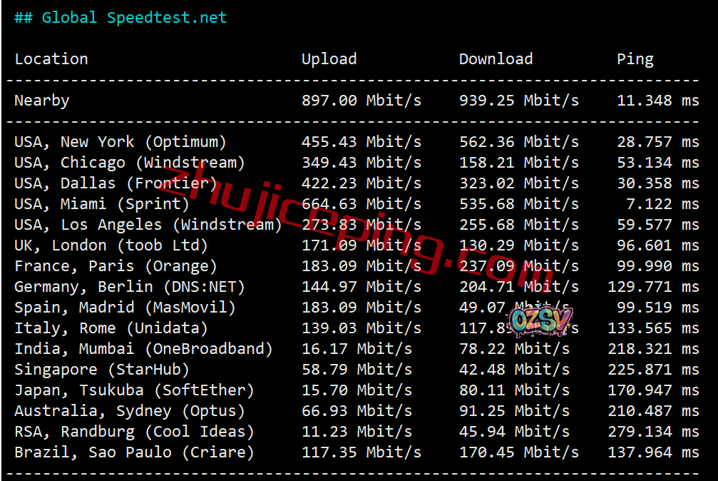 继续看看美国、欧洲、亚洲、非洲部分节点的上下行测试数据: