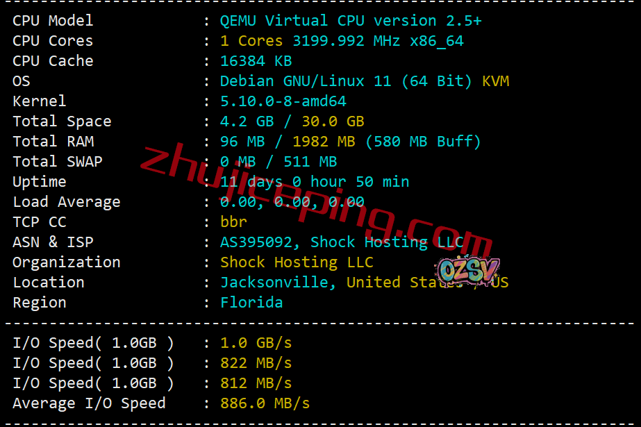 这母鸡的CPU是3.2GHz,型号未知,shockhosting自己的IP,站长启用了BBR,当前I/O大致在886MB/S: