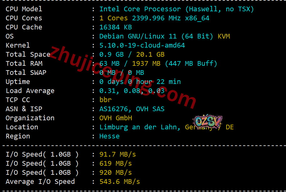 CPU型号未知,主频2.4GHz,站长启用了BBR,OVH自己的AS,IP归属德国,硬盘I/O大致在543MB/S: