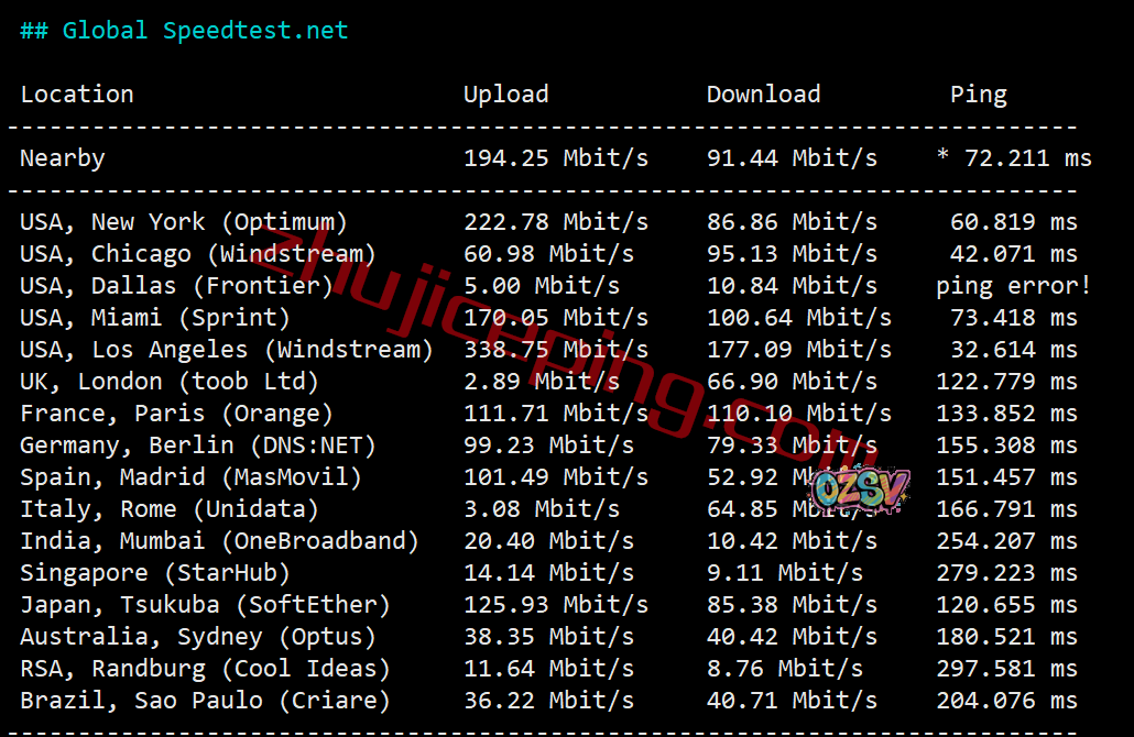 speedtest的国际部分节点,有欧美亚非的实测效果: