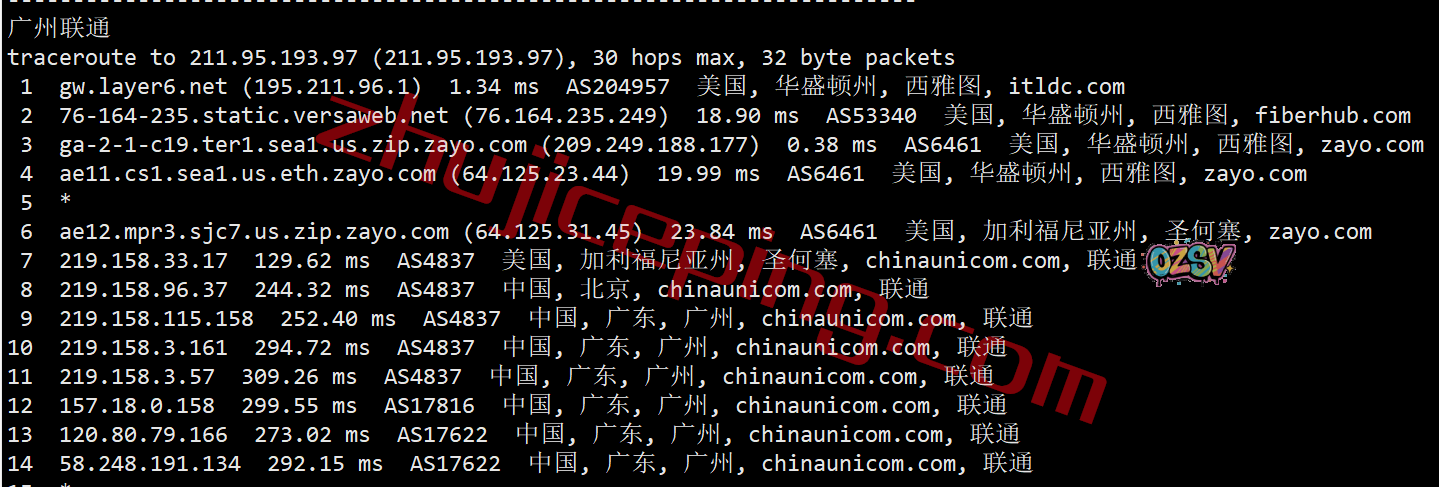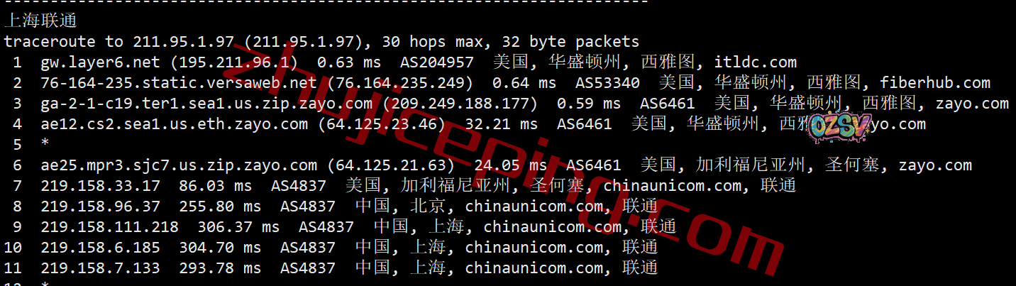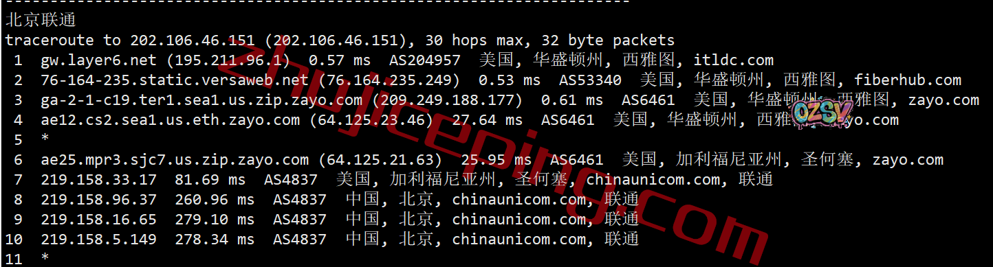 联通去程:联通直连美西自家节点后转zayo从圣何塞去西雅图