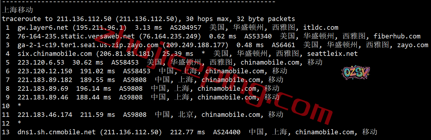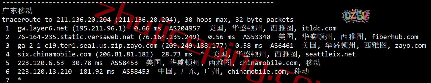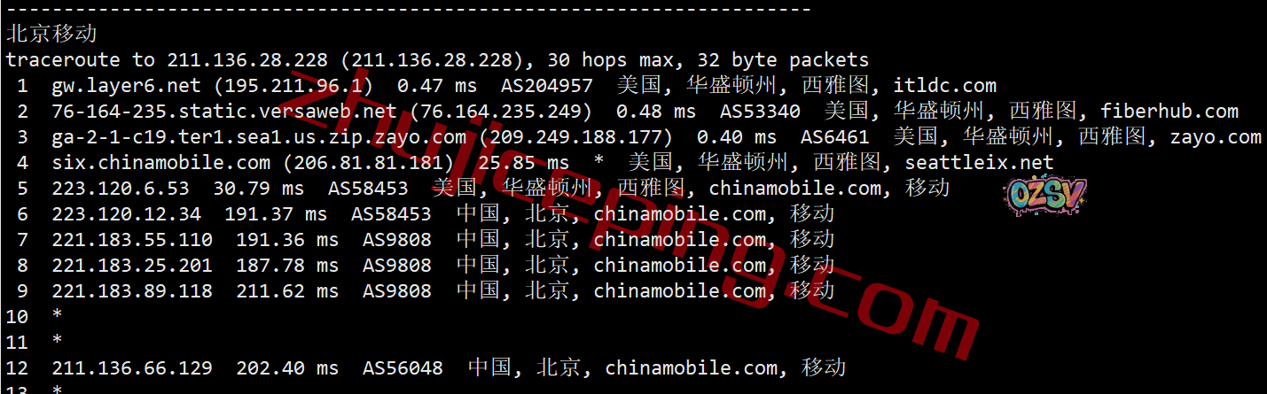 移动去程:CMI直连西海岸后转zayo从洛杉矶过圣何塞去西雅图