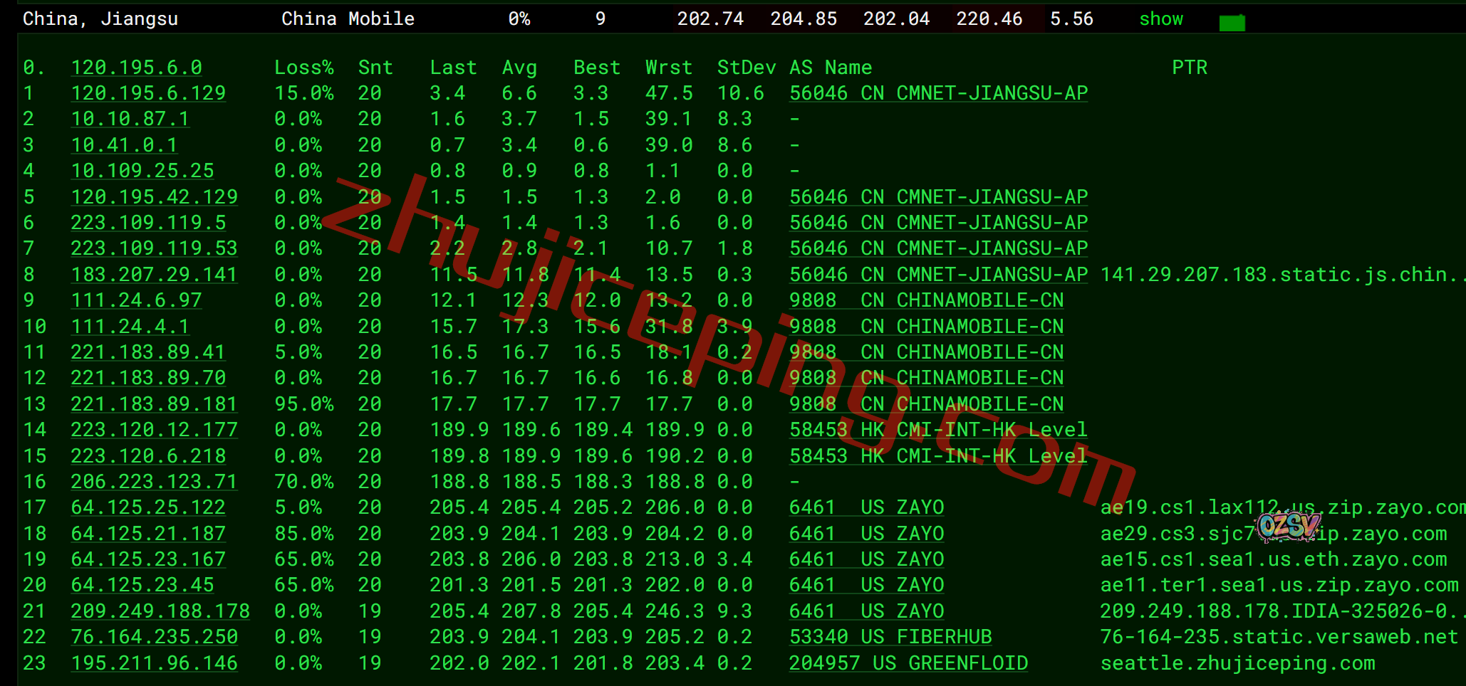 继续相同的测试,只不过时间段是晚高峰,这会儿骨干网炸裂了,看看实测效果: